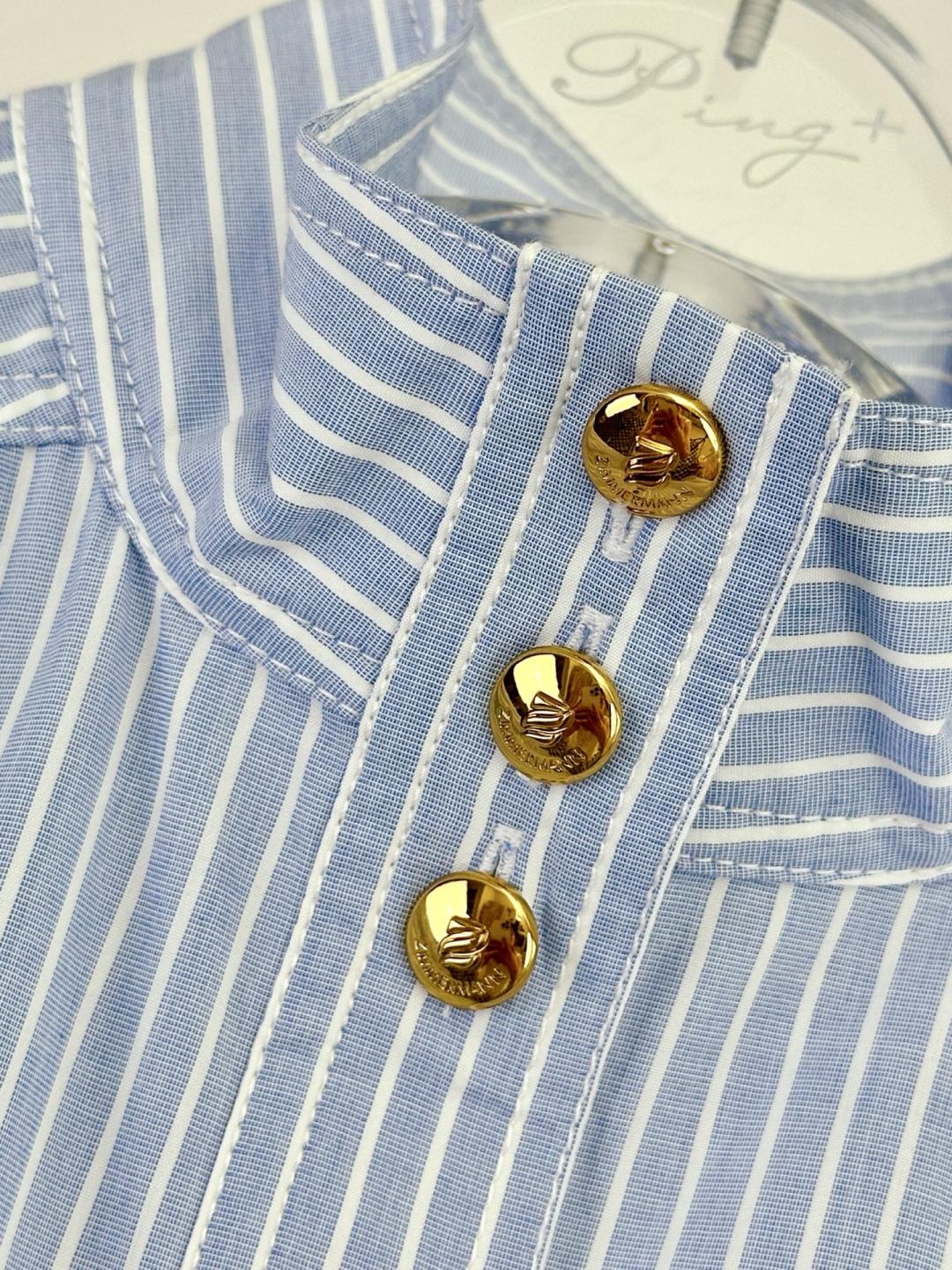 Elevate your wardrobe with this Zimmermann striped blouse.100% cotton, high neck, long sleeves, and gold button details. Perfect for fall!