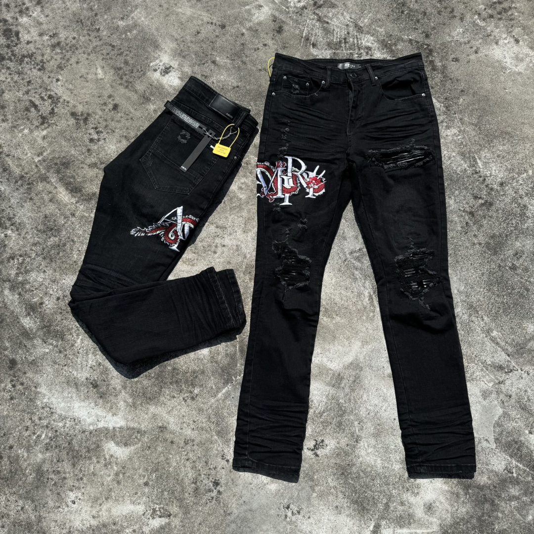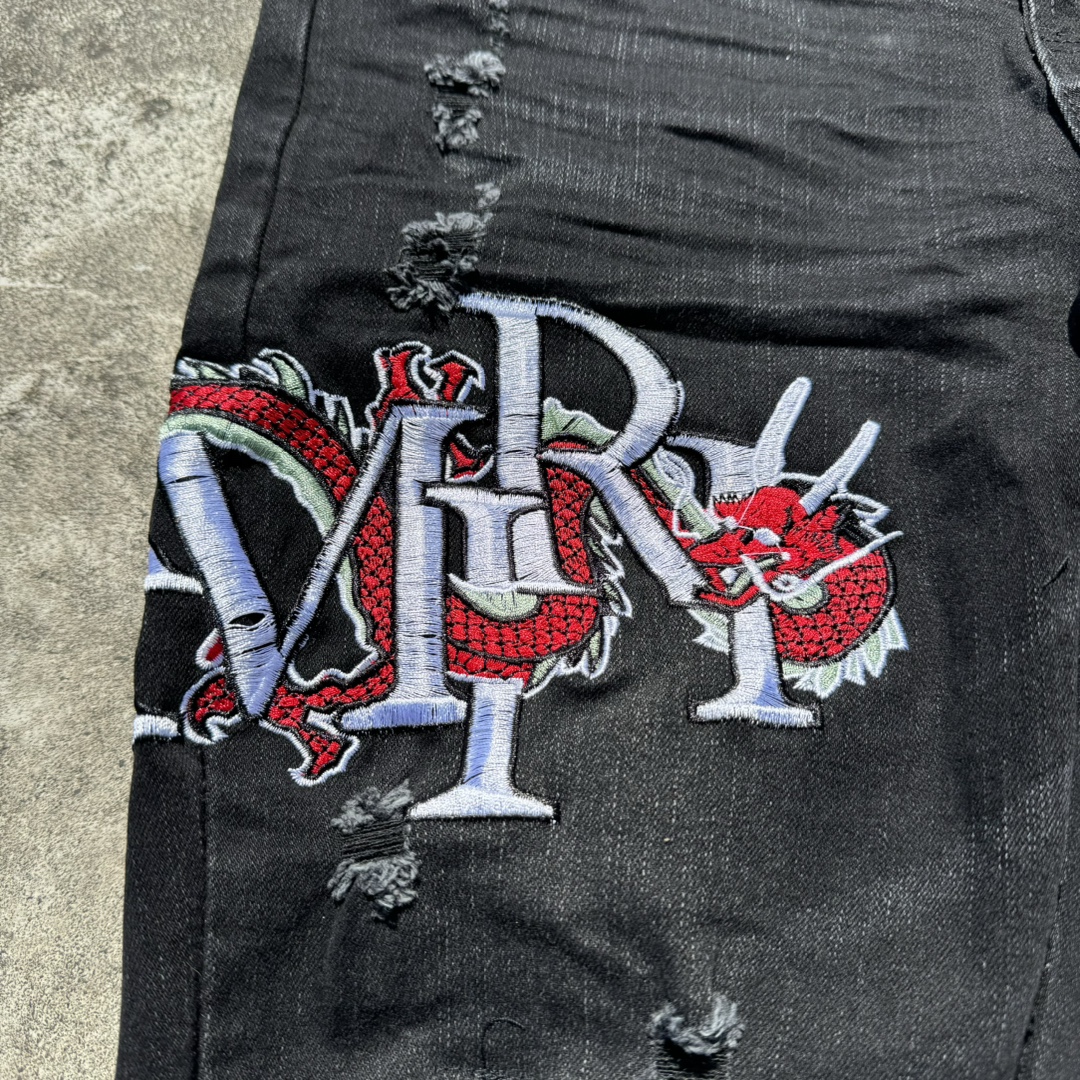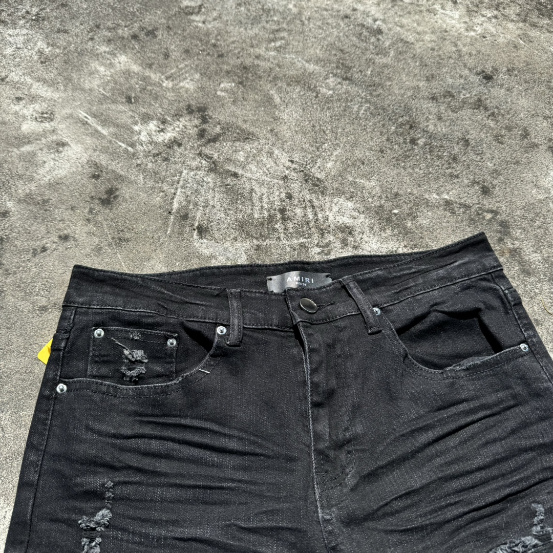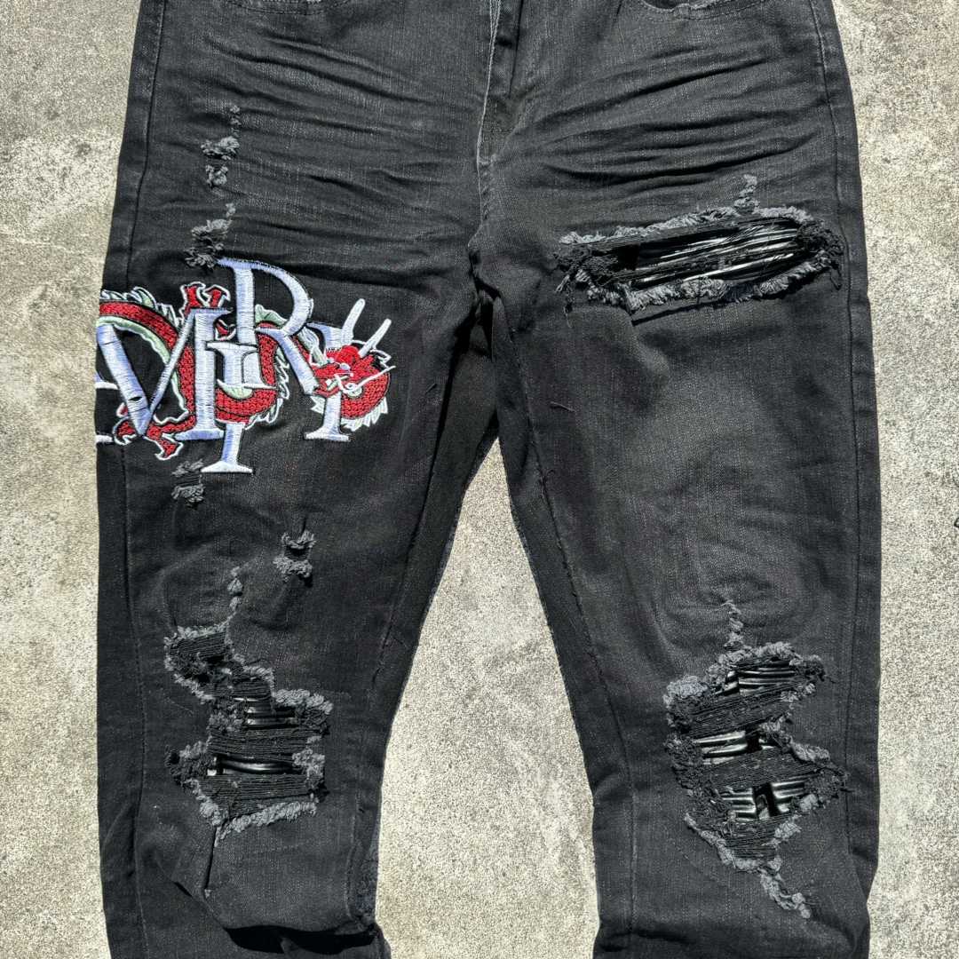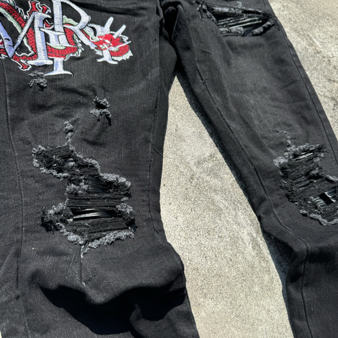 Amiri Men's Black Distressed Slim Fit Jeans with Embroidered Patches