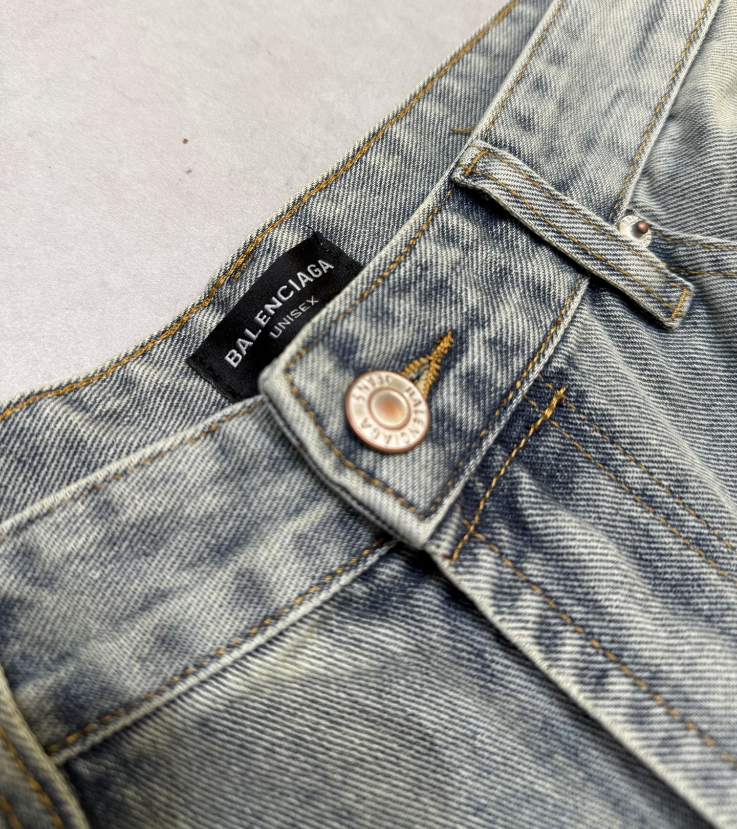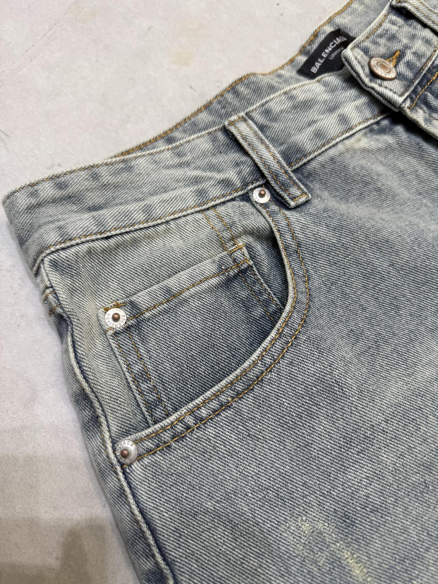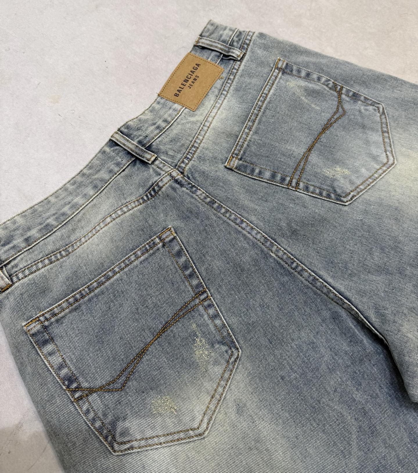 Elevate your style with these Balenciaga BLCG wide-leg jeans. Distressed details, unique patches, and a comfortable fit for both men and women.