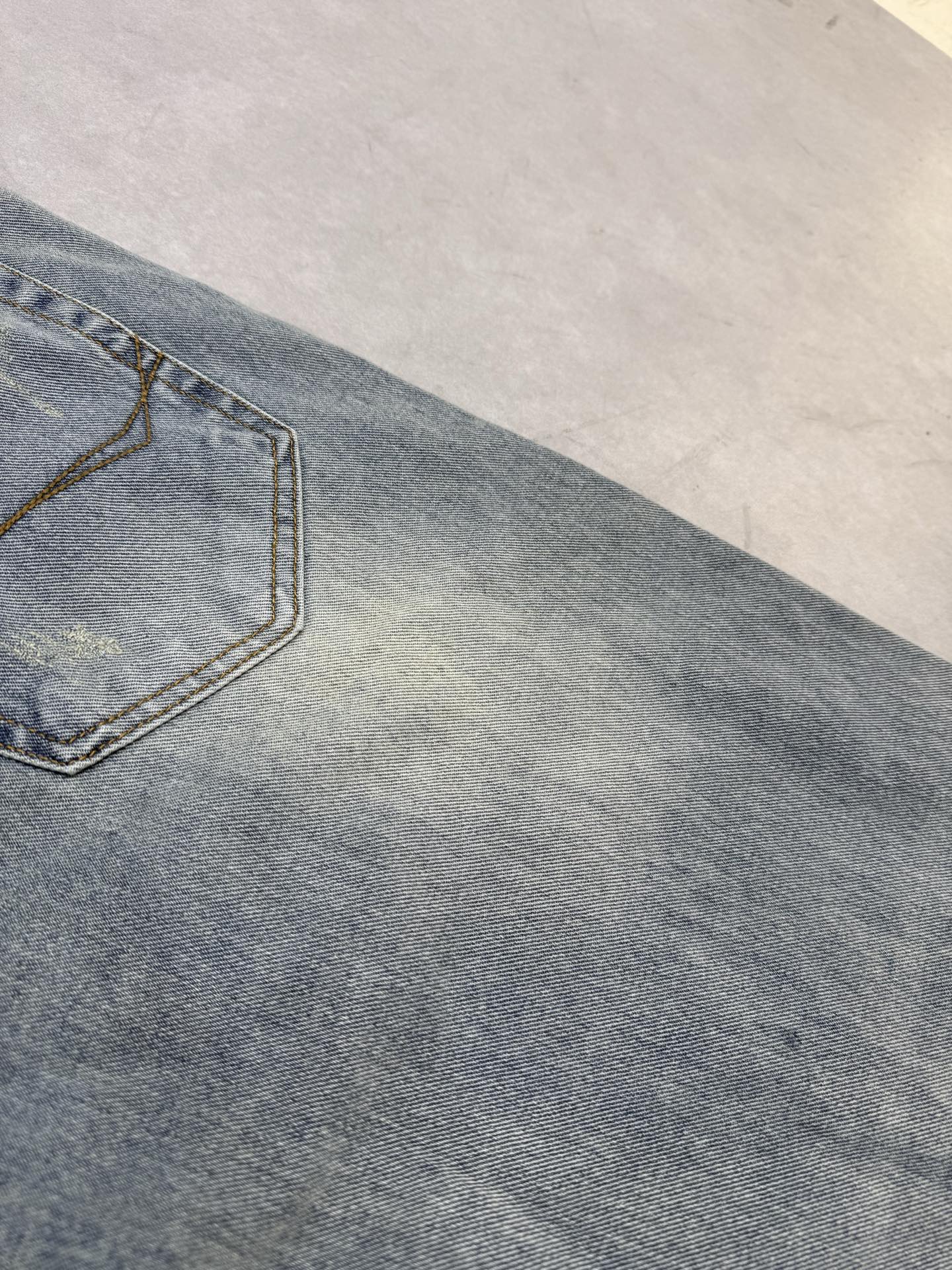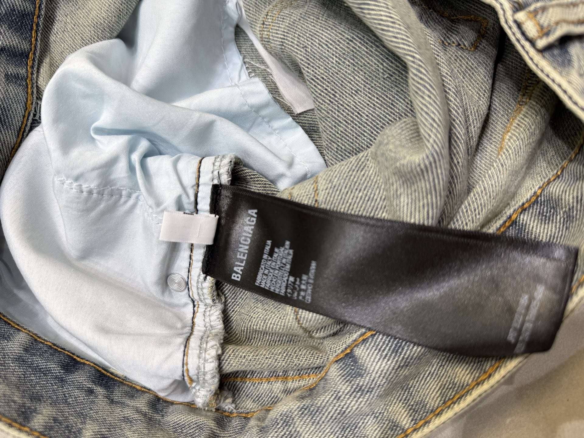These Balenciaga BLCG wide-leg jeans are a bold statement piece for any wardrobe. Featuring a unique design with distressed details and patchwork, these jeans offer a blend of comfort and high fashion.