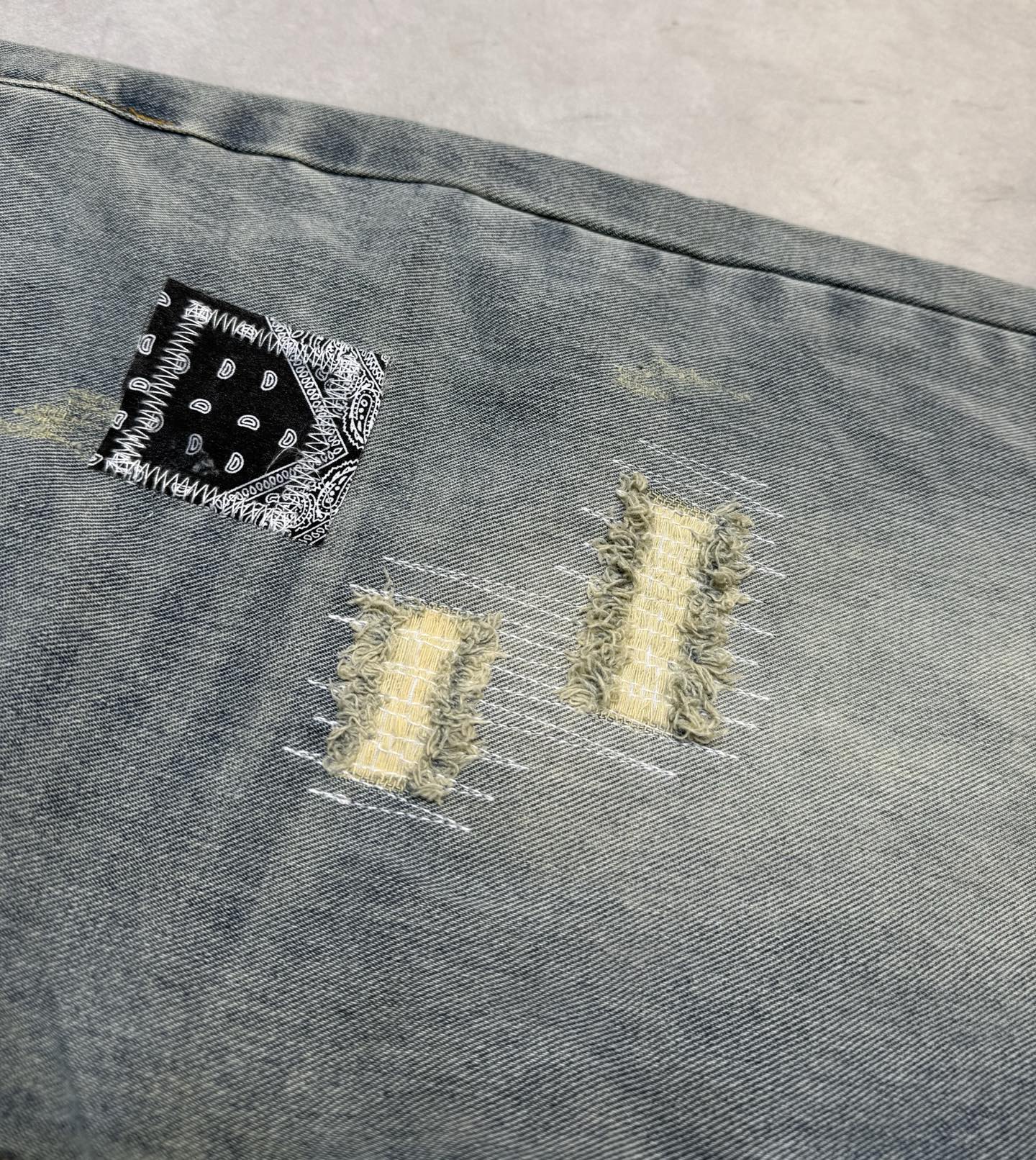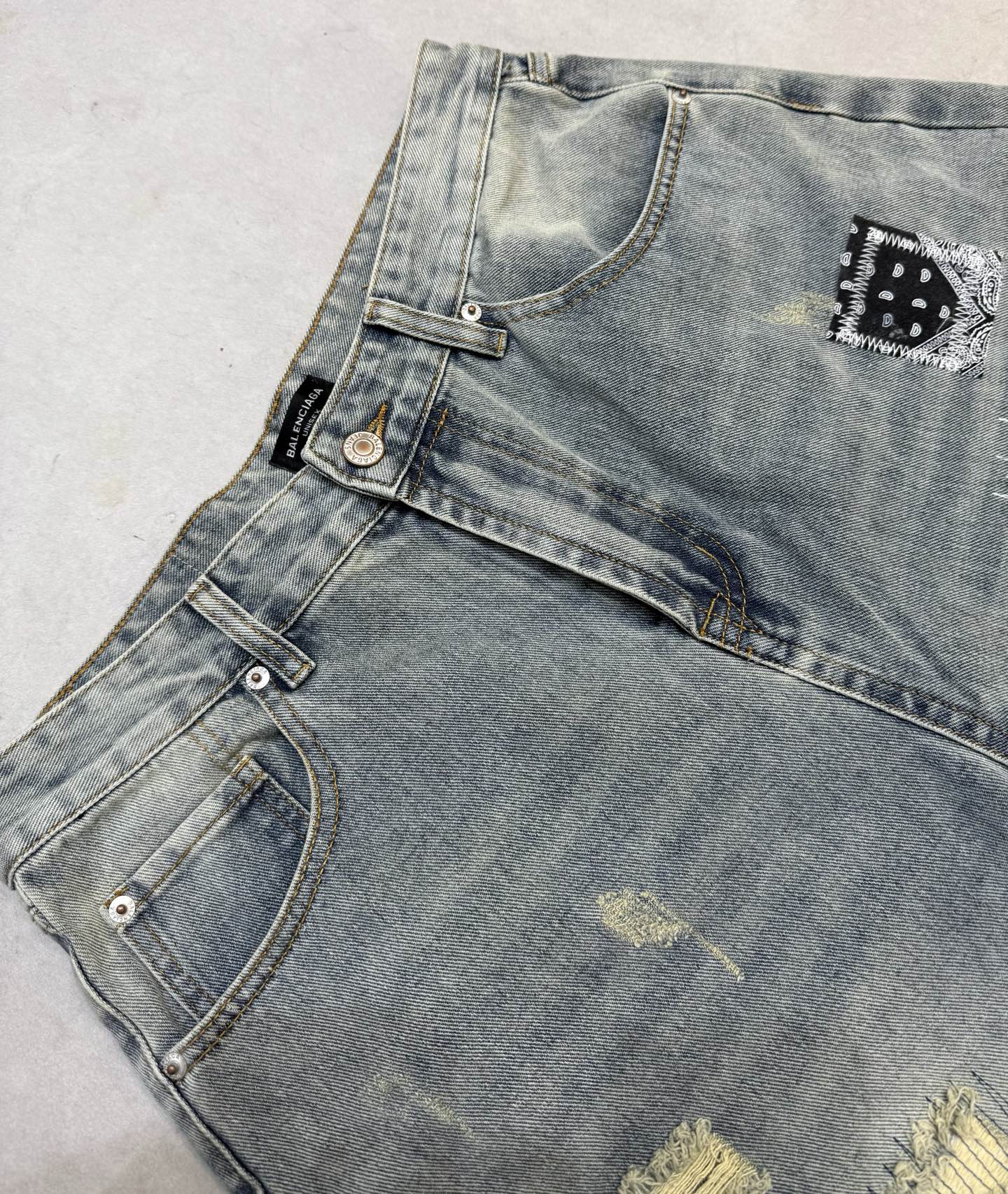 Tags: Baggy Fit Jeans, Balenciaga Style Jeans, Distressed Wide Leg Jeans, Patchwork Denim Pants, Unisex Designer Jeans, Washed Denim Trousers