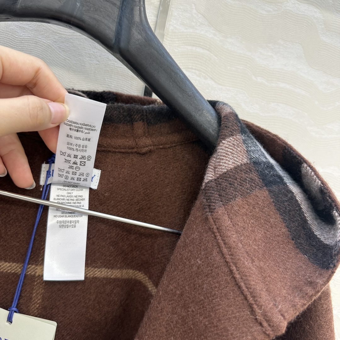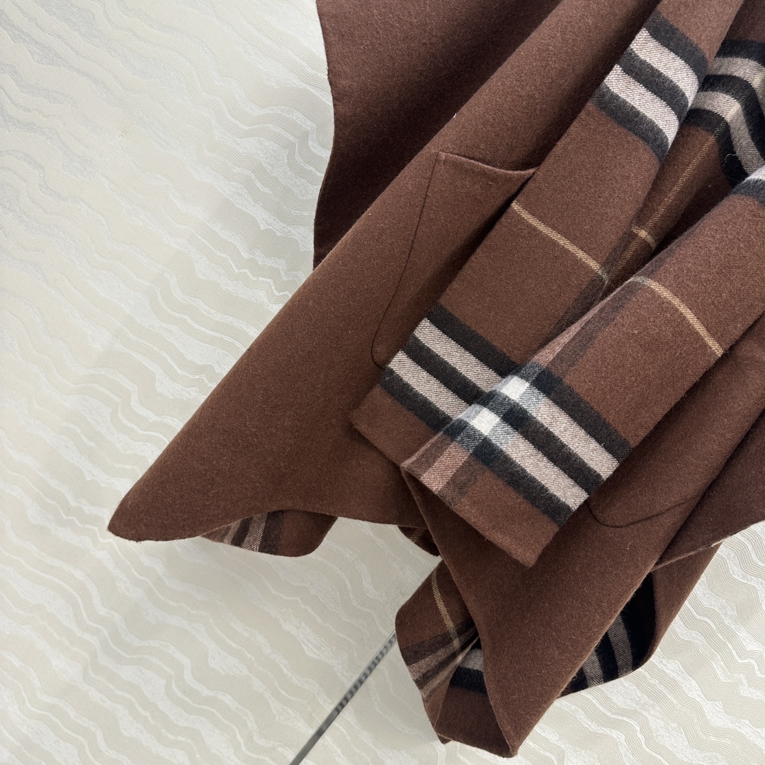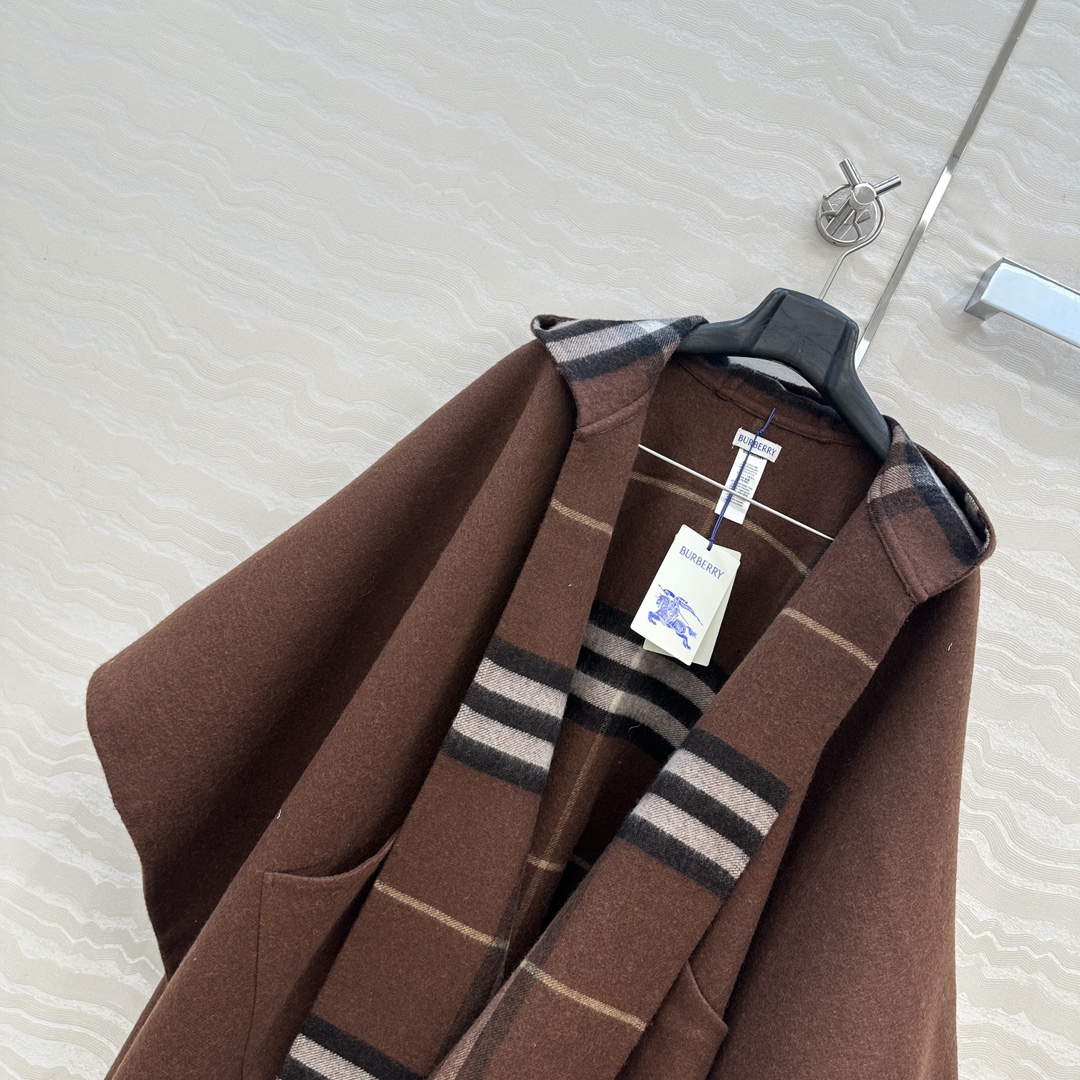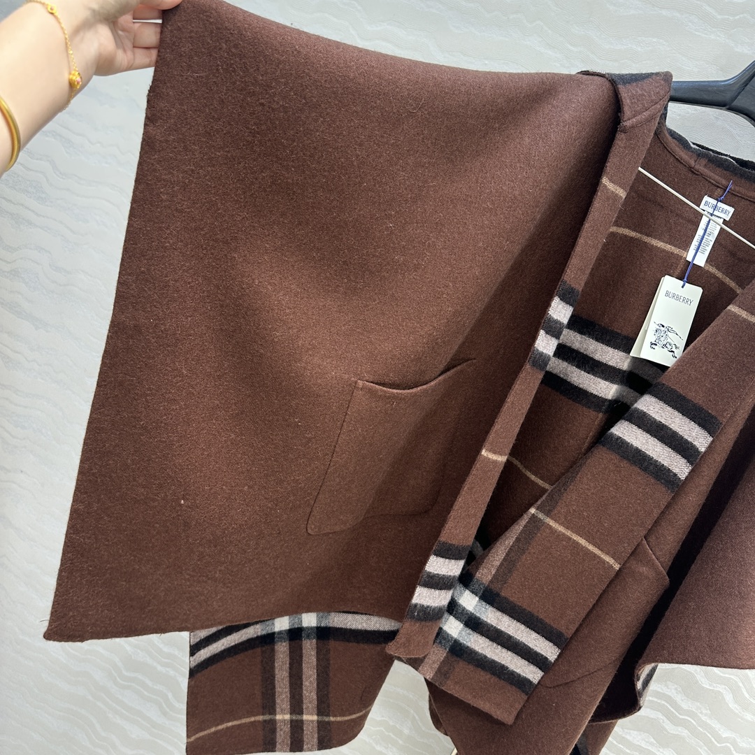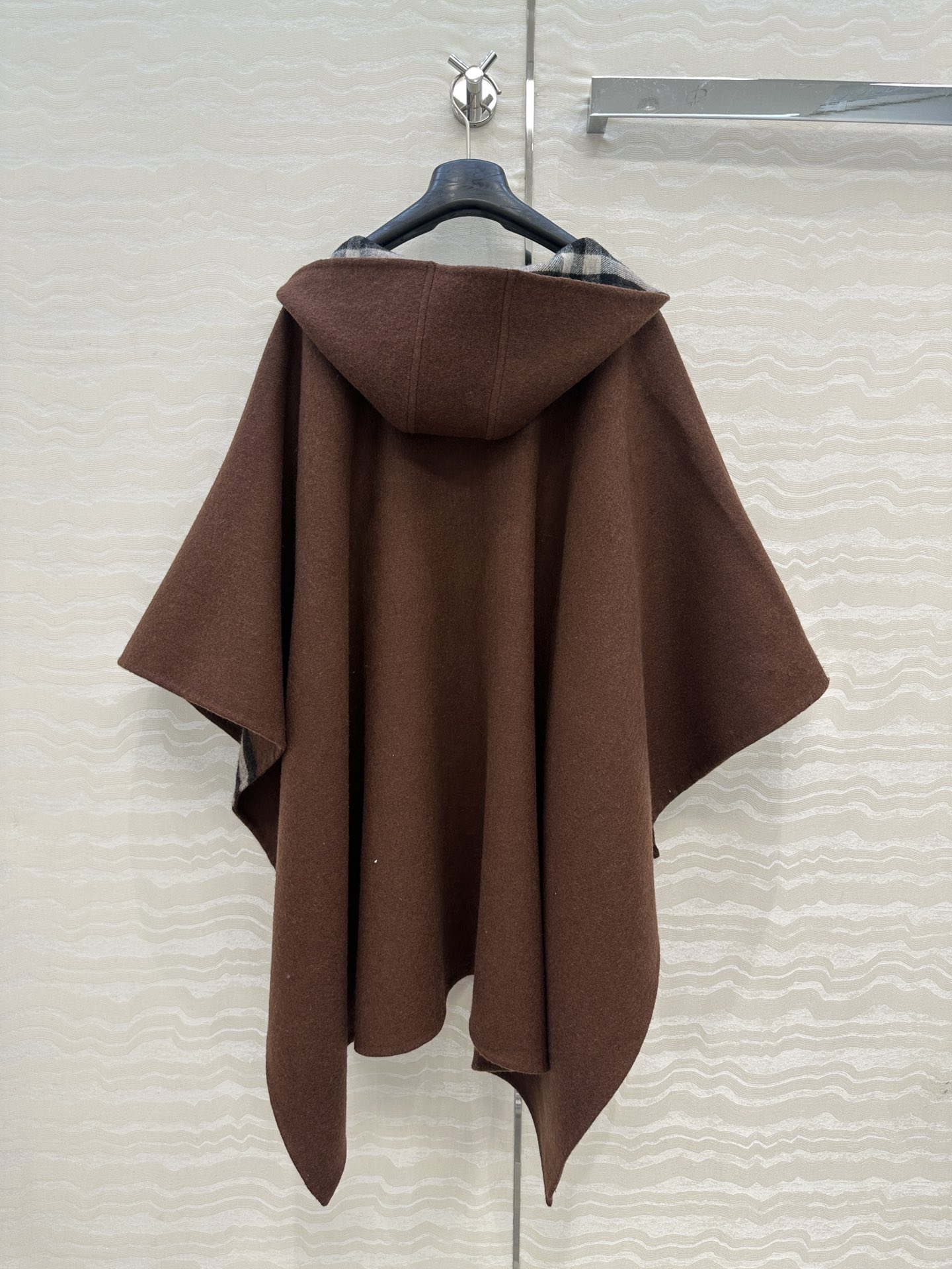 Burberry Wool Cape Hooded Poncho Brown Plaid Double-Sided Embroidery