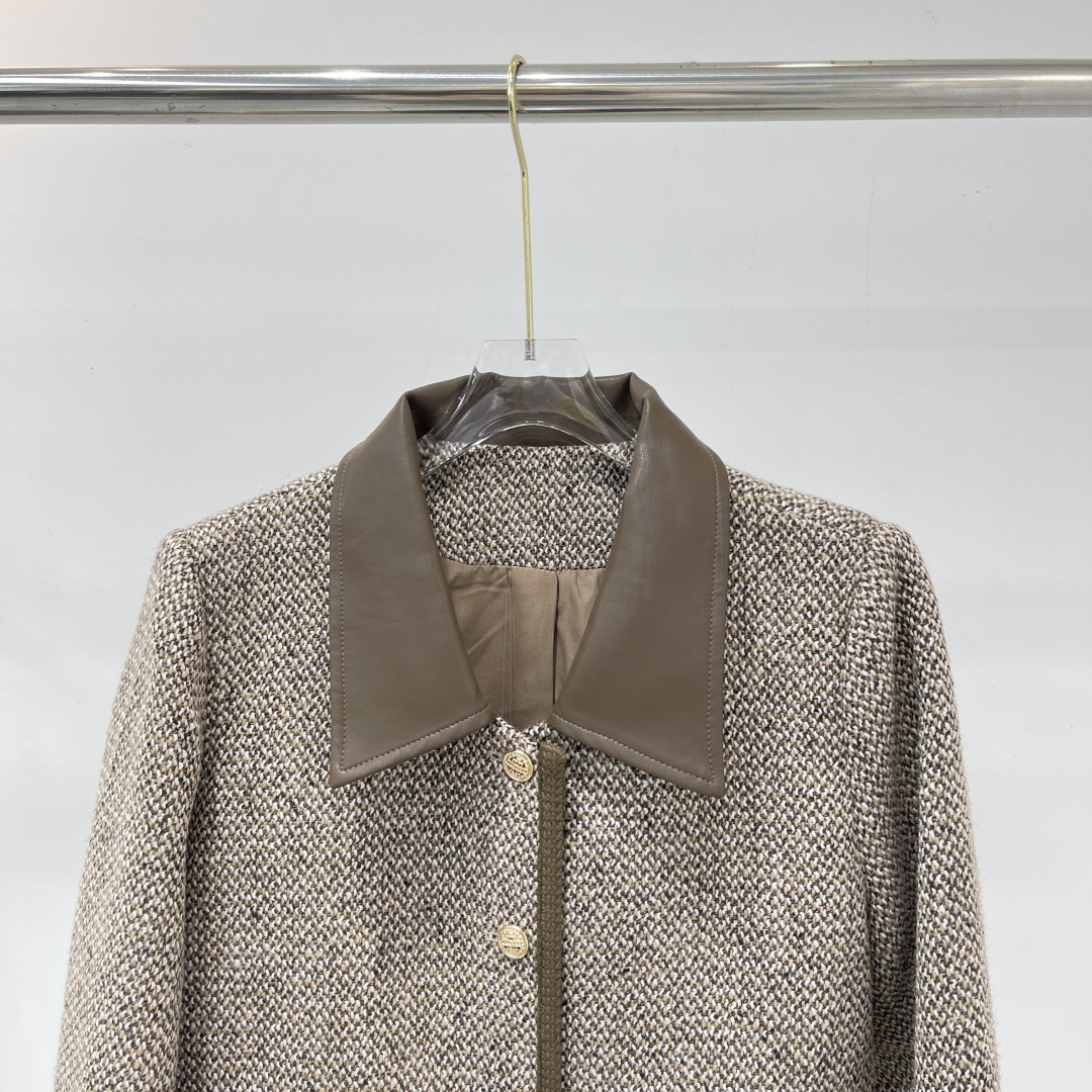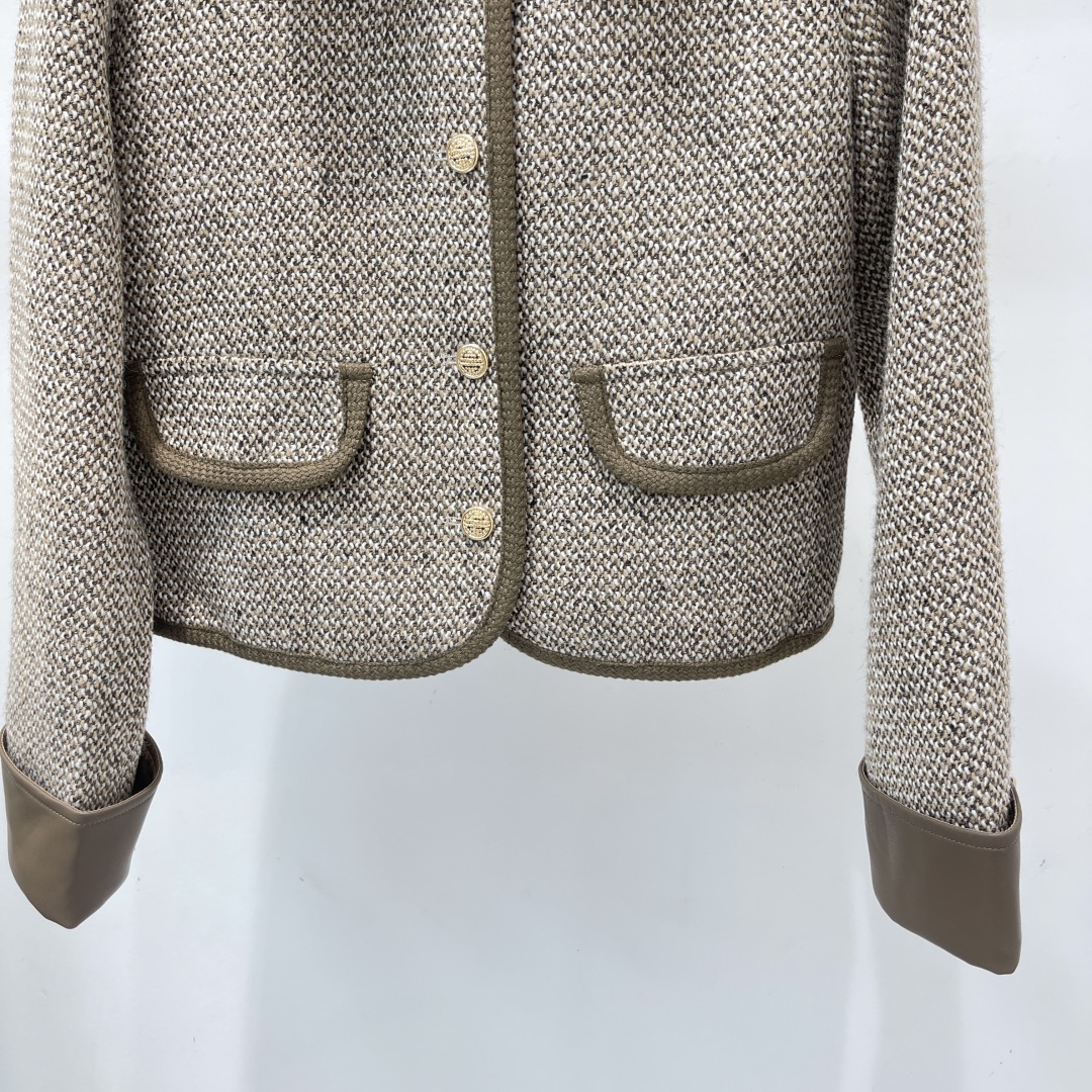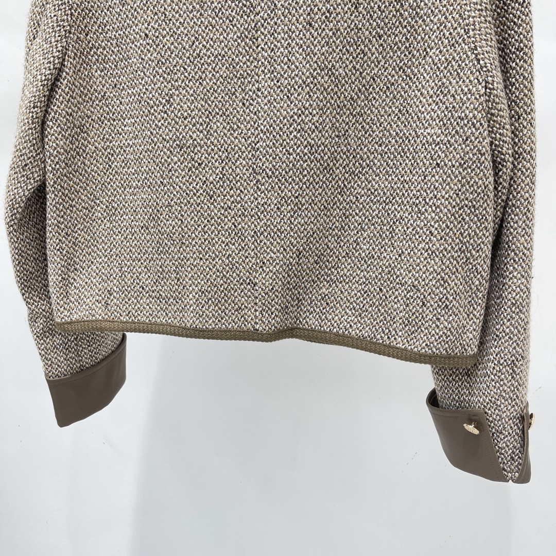 This Chanel-Inspired tweed skirt suit combines classic elegance with modern style. The set includes a beautifully tailored jacket and a pleated skirt, both made from high-quality tweed fabric and accented with sophisticated leather trim.