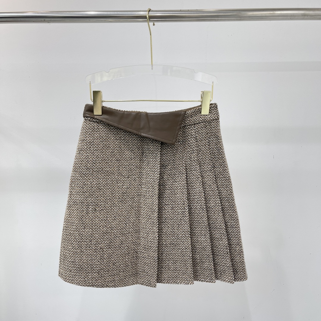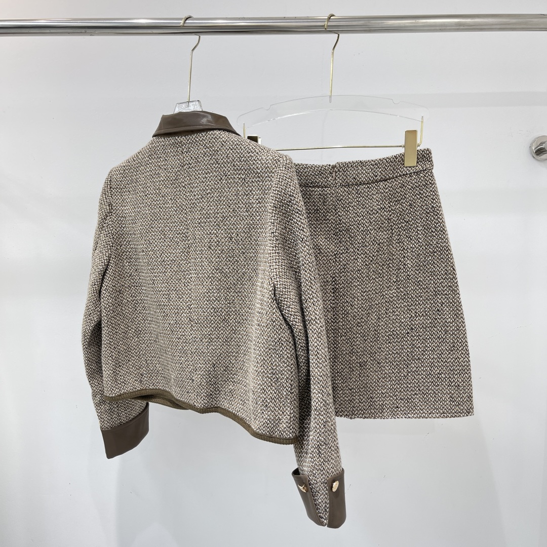 Sophisticated tweed skirt suit featuring a stylish jacket and pleated skirt, accented with leather trim. Perfect for a chic, polished look.