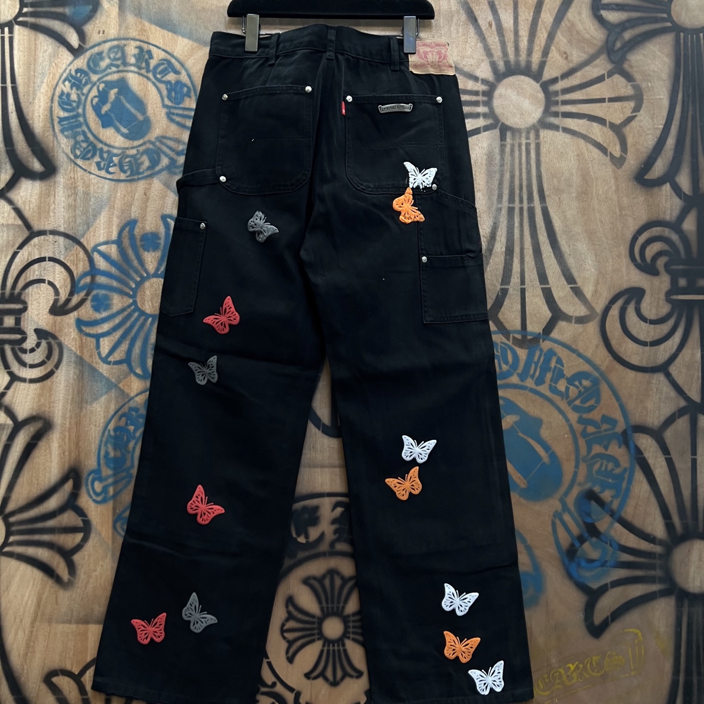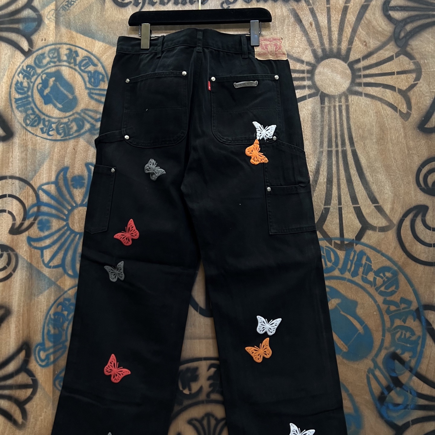 Chrome Hearts limited edition butterfly denim jeans. Vintage Levi's 501 remake with imported lambskin and 925 silver. Customized fit available.