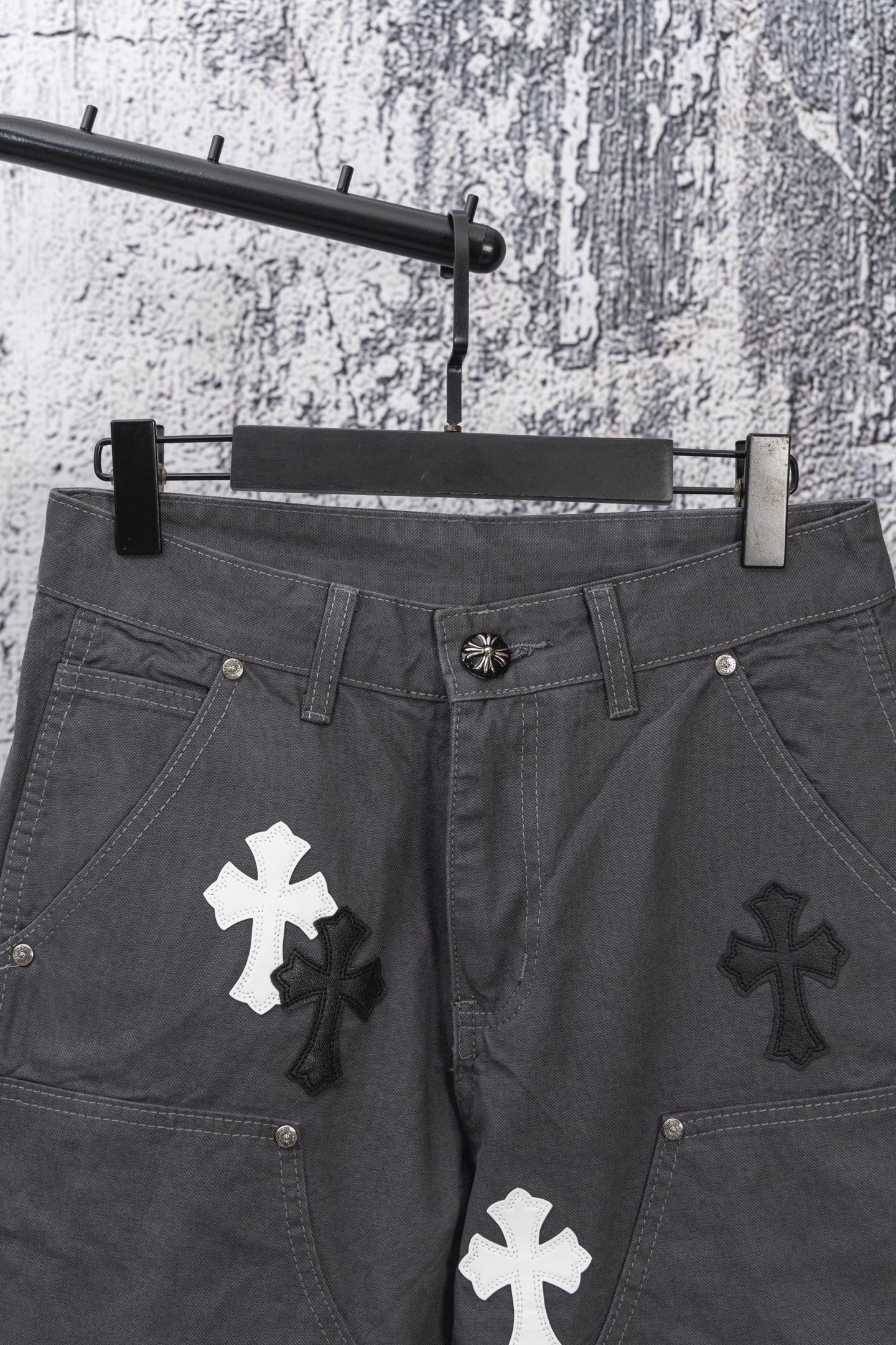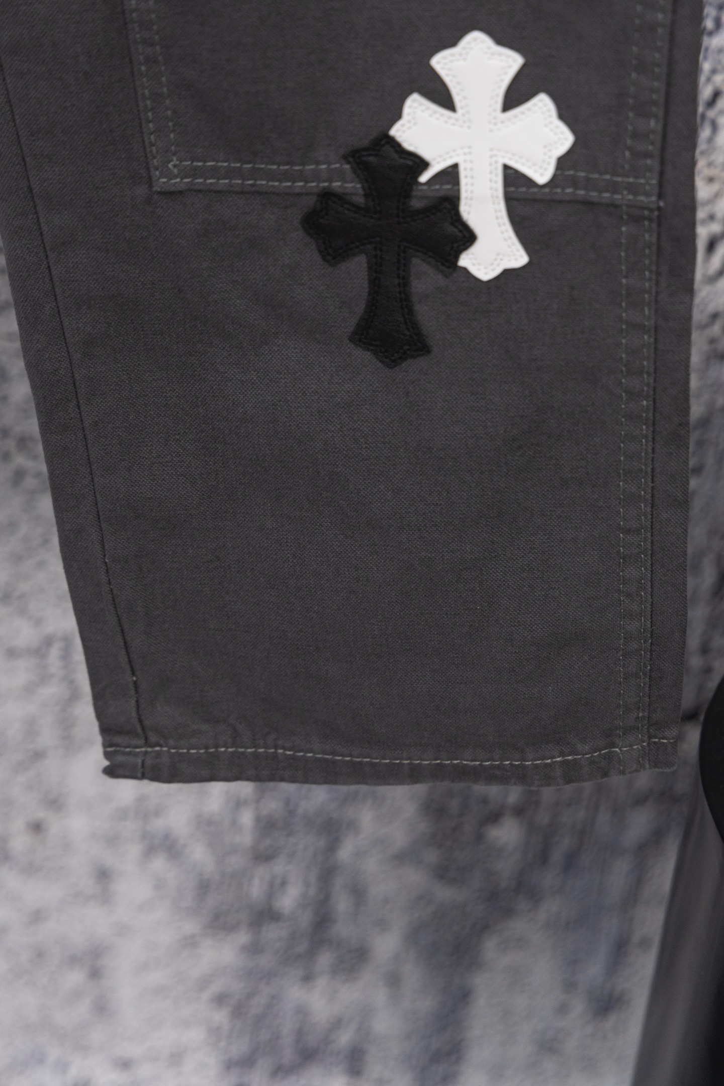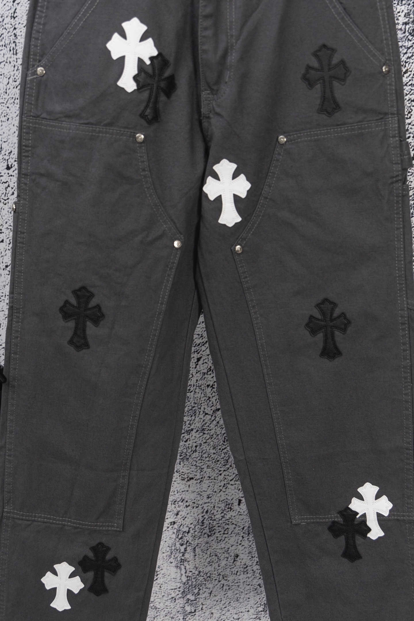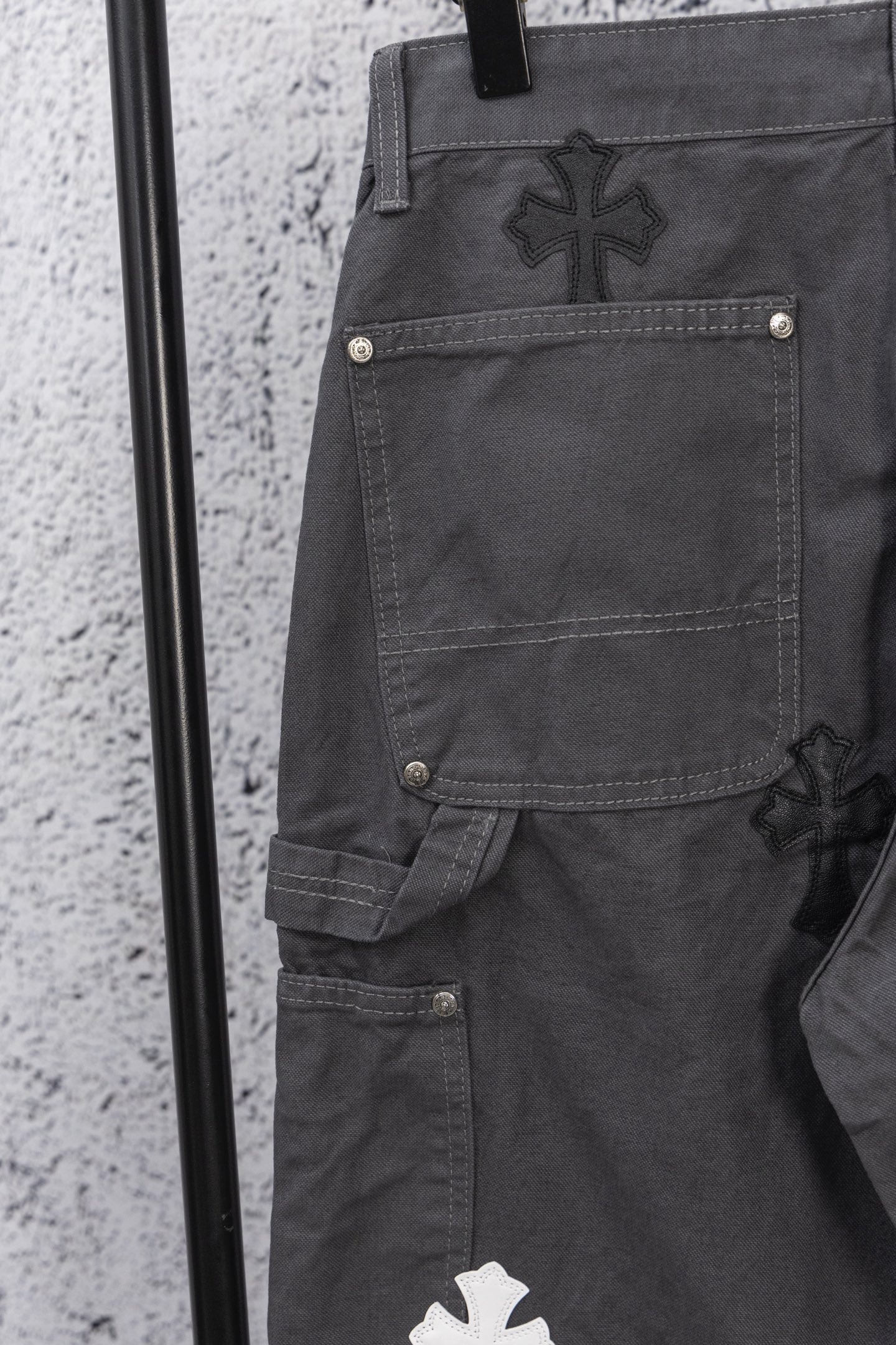Elevate your street style with these Chrome Hearts grey carpenter jeans. Featuring unique cross patches and a comfortable fit, these denim pants are a must-have.