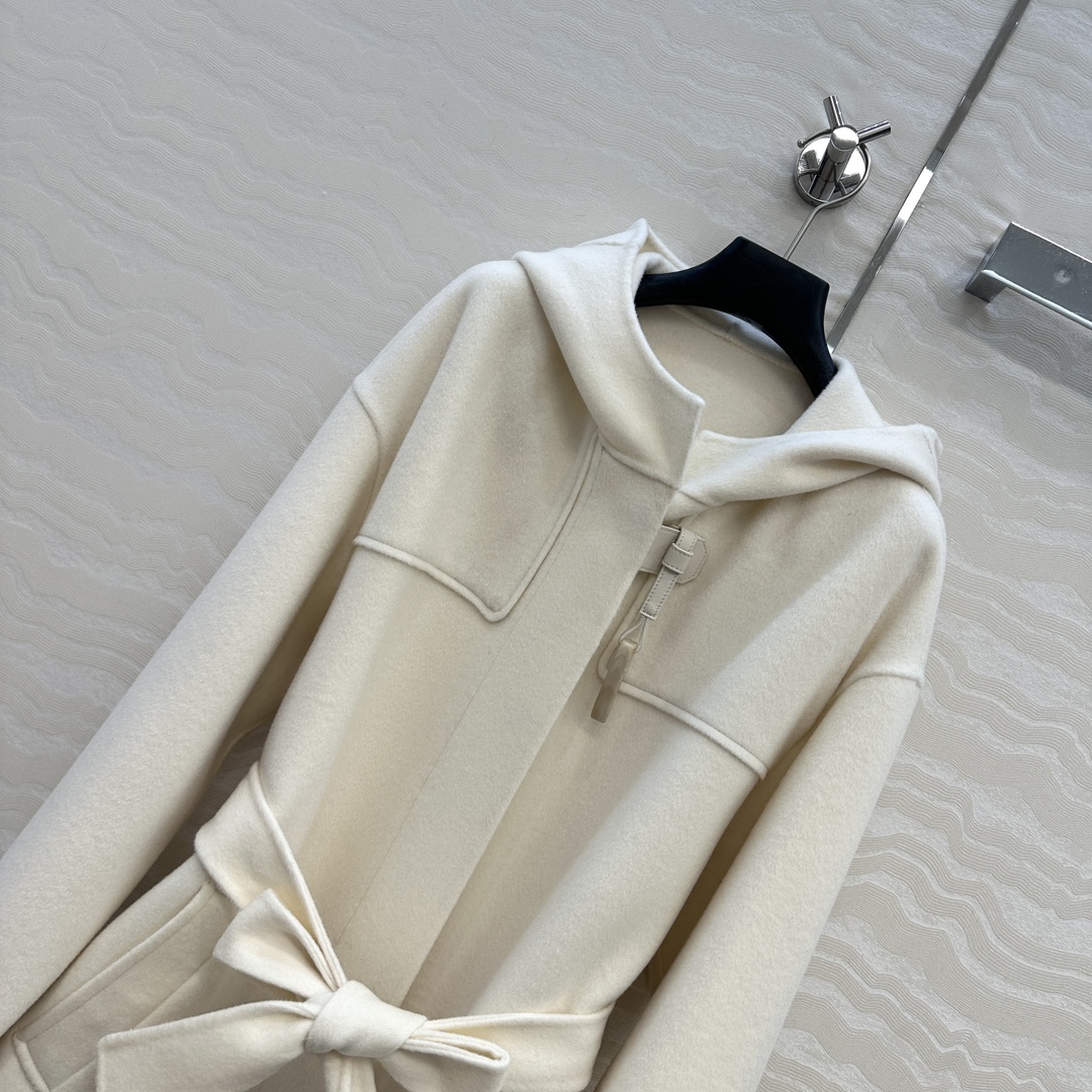 Elevate your style with this sophisticated, handmade wool and cashmere blend hooded coat, featuring luxurious leather accents and a timeless design.