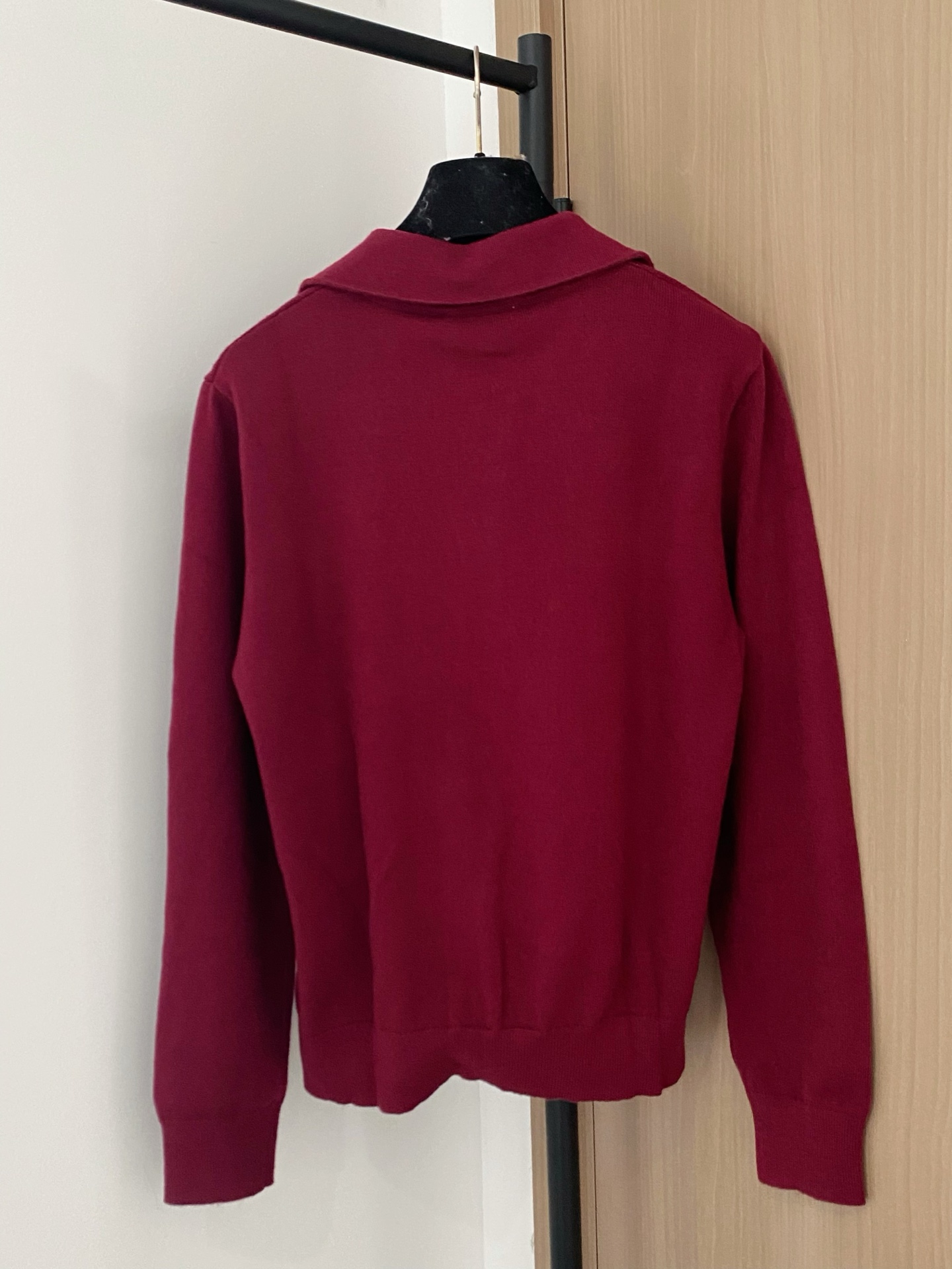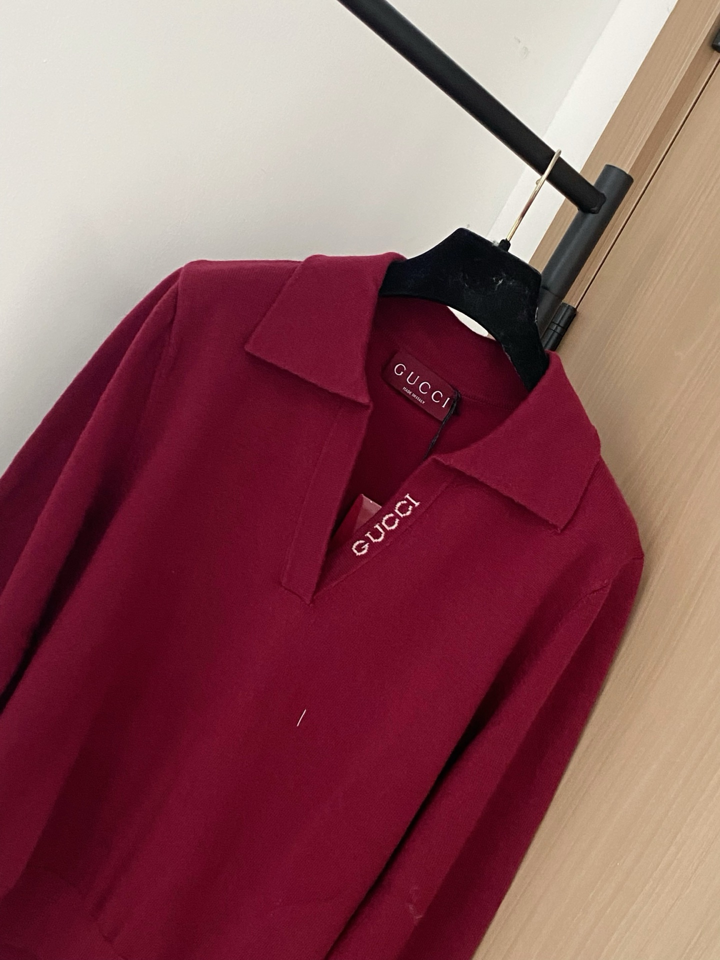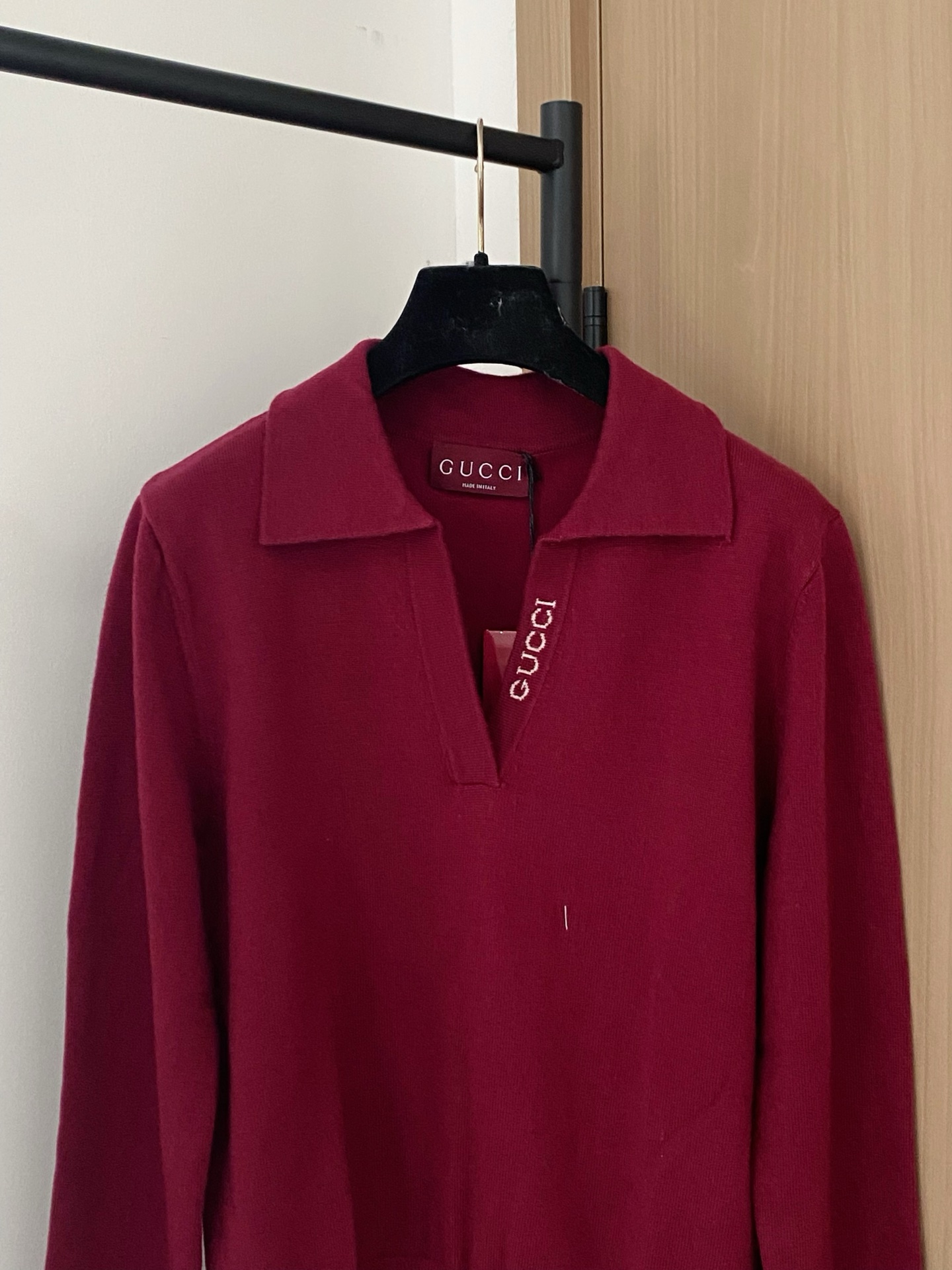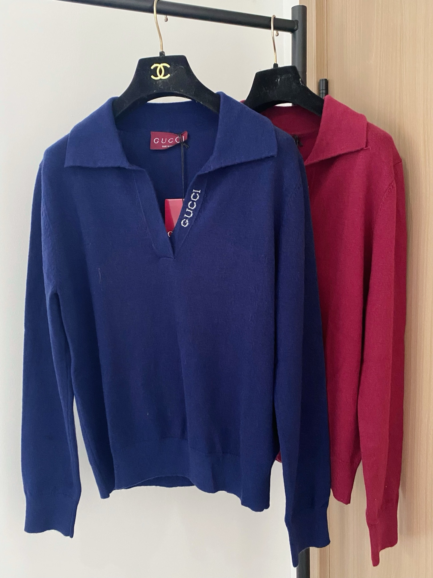 Tags: Designer Long Sleeve Top, Gucci Polo Shirt, Luxury Polo Shirt, Red Polo Shirt Women, Slim Fit Long Sleeve Shirt, Women's Logo Applique Shirt