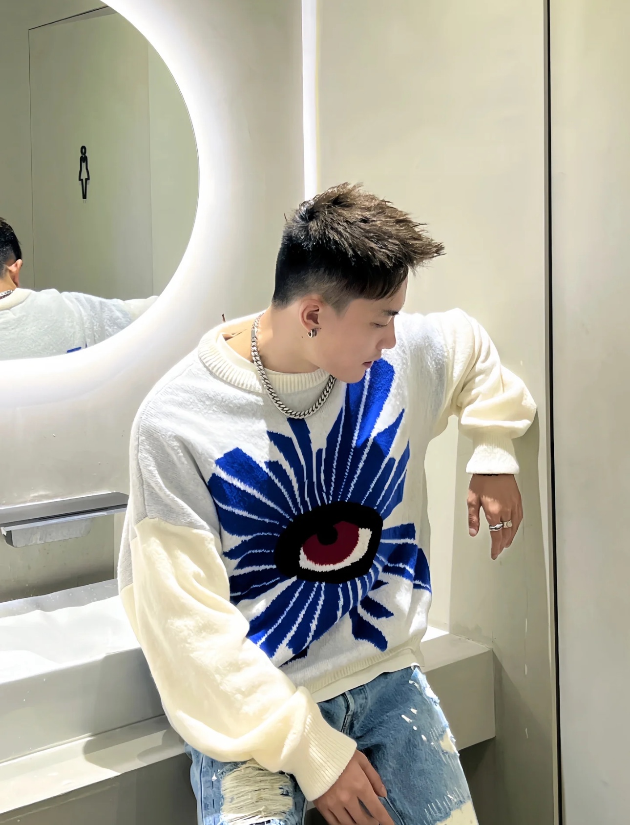 Tags: Designer Knitwear, Eye Graphic Sweater, House Of Errors Sweater, Long Sleeve Sweater, Mohair Blend Sweater, Relaxed Fit Sweater