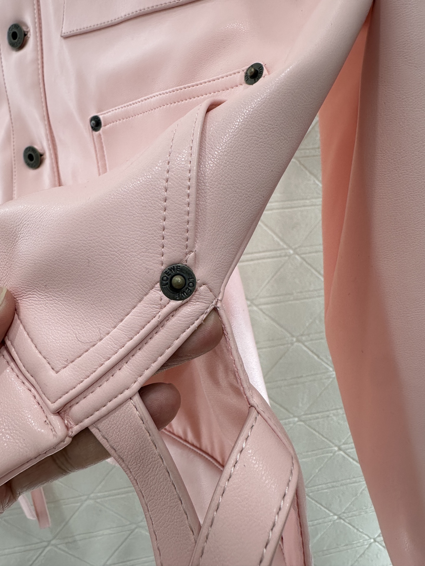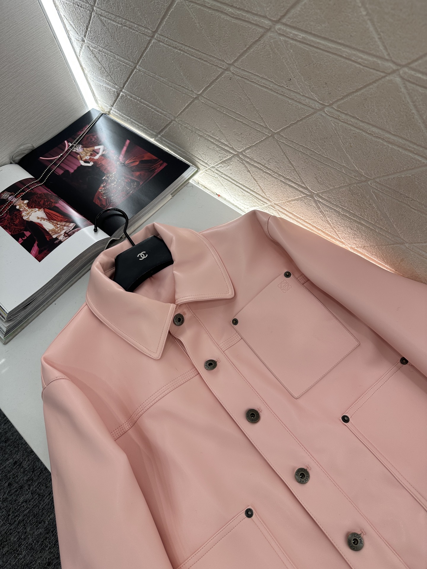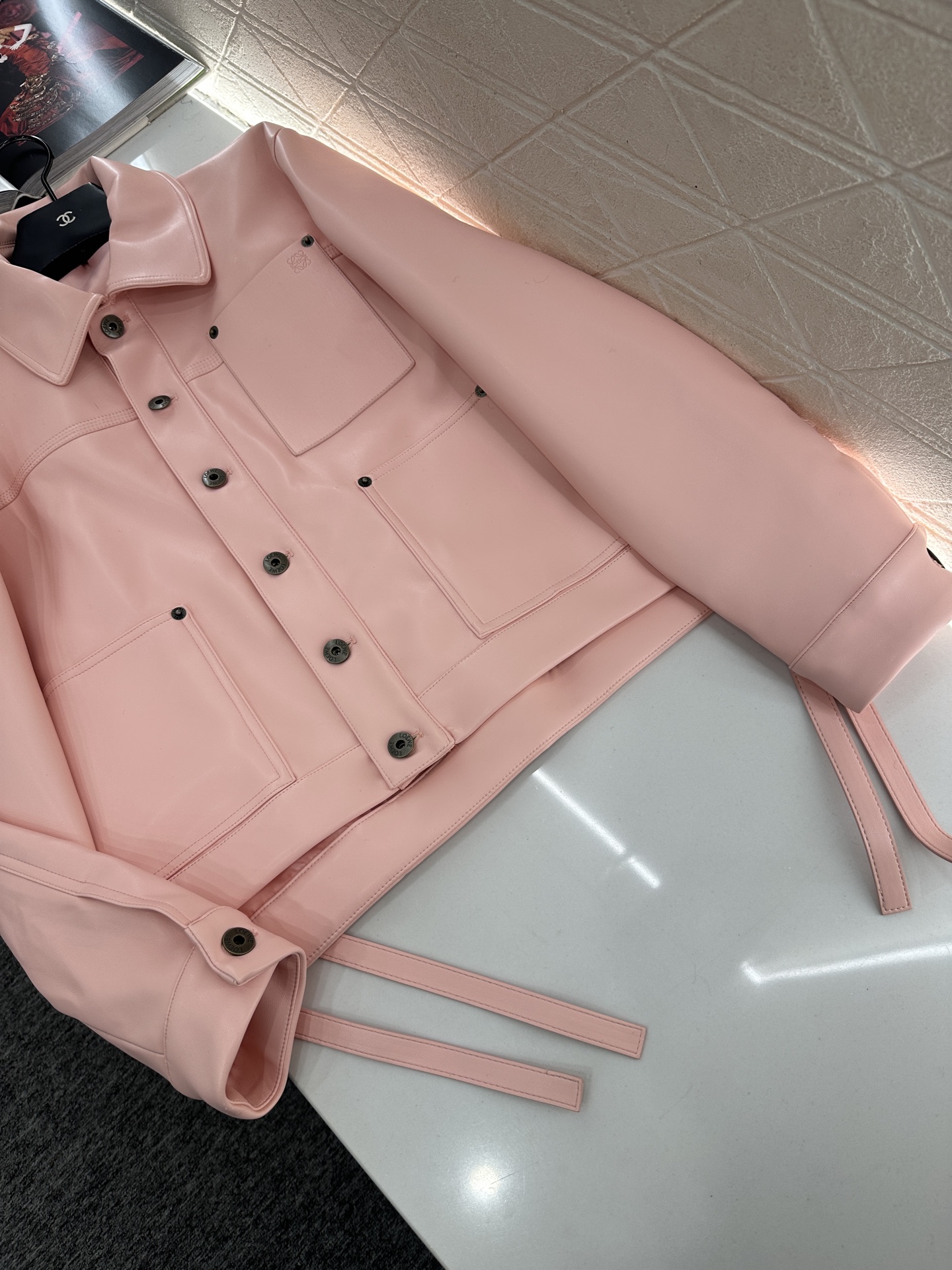This Loewe 2025 pink leather jacket is a must-have for fashion-forward wardrobes. It features a delicate texture and unique design elements, offering a blend of style and comfort.