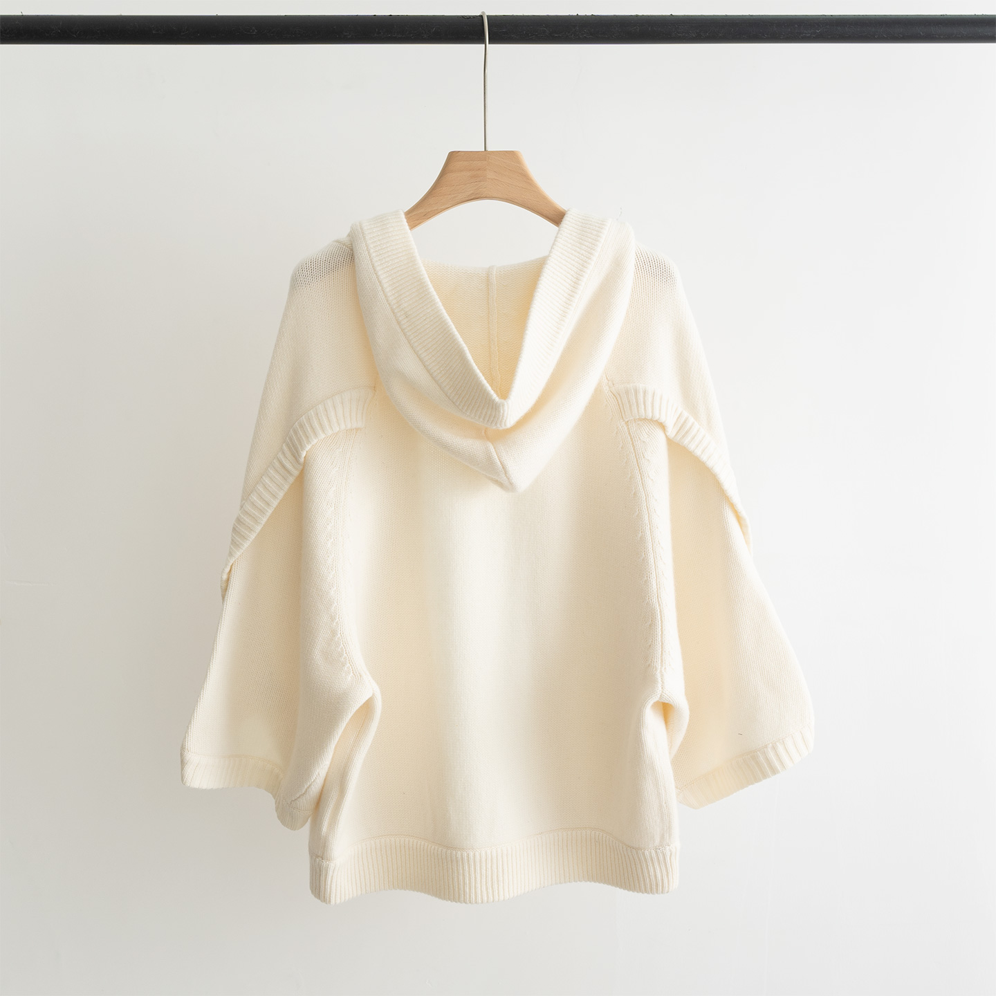 Crafted from a luxurious blend of wool and cashmere, this hooded cape offers both warmth and style. Its unique design and elegant details make it a versatile addition to any wardrobe.