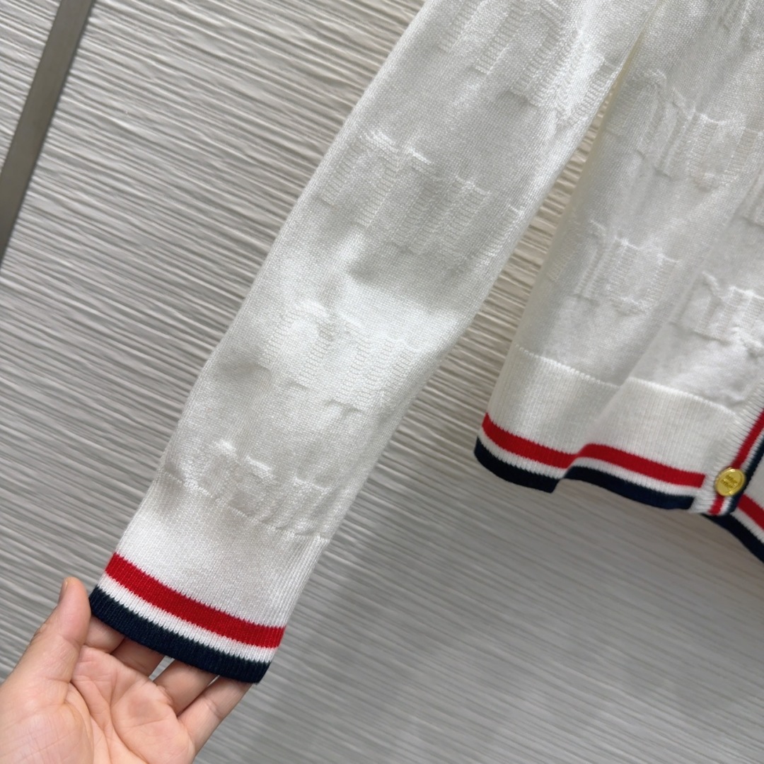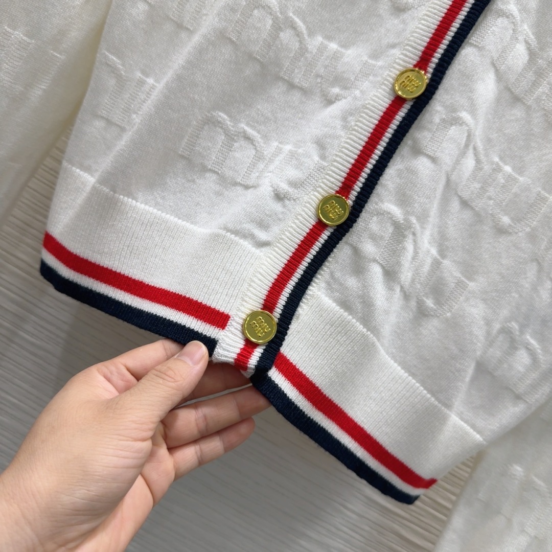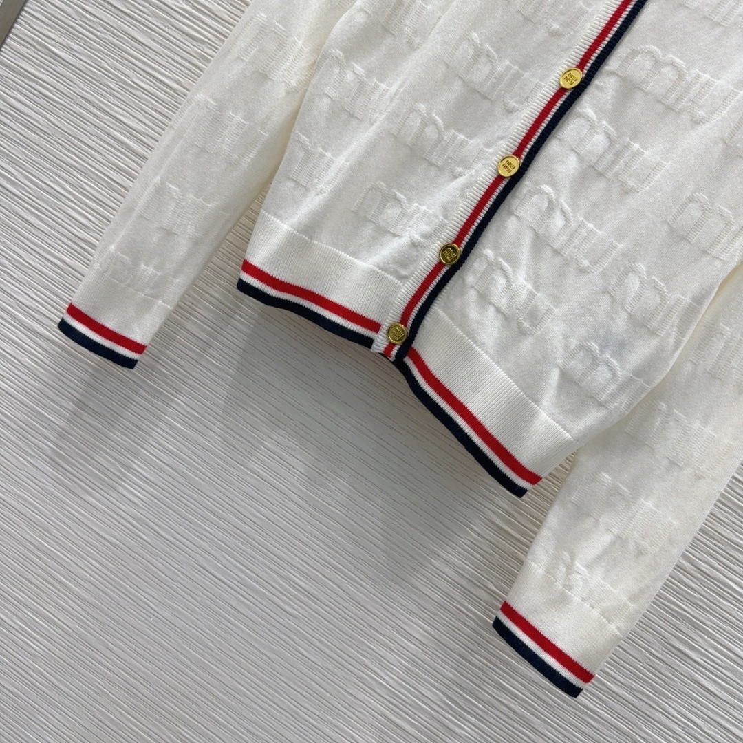 Miu Miu White Wool Cardigan with Red and Navy Trim, Gold Button Closure