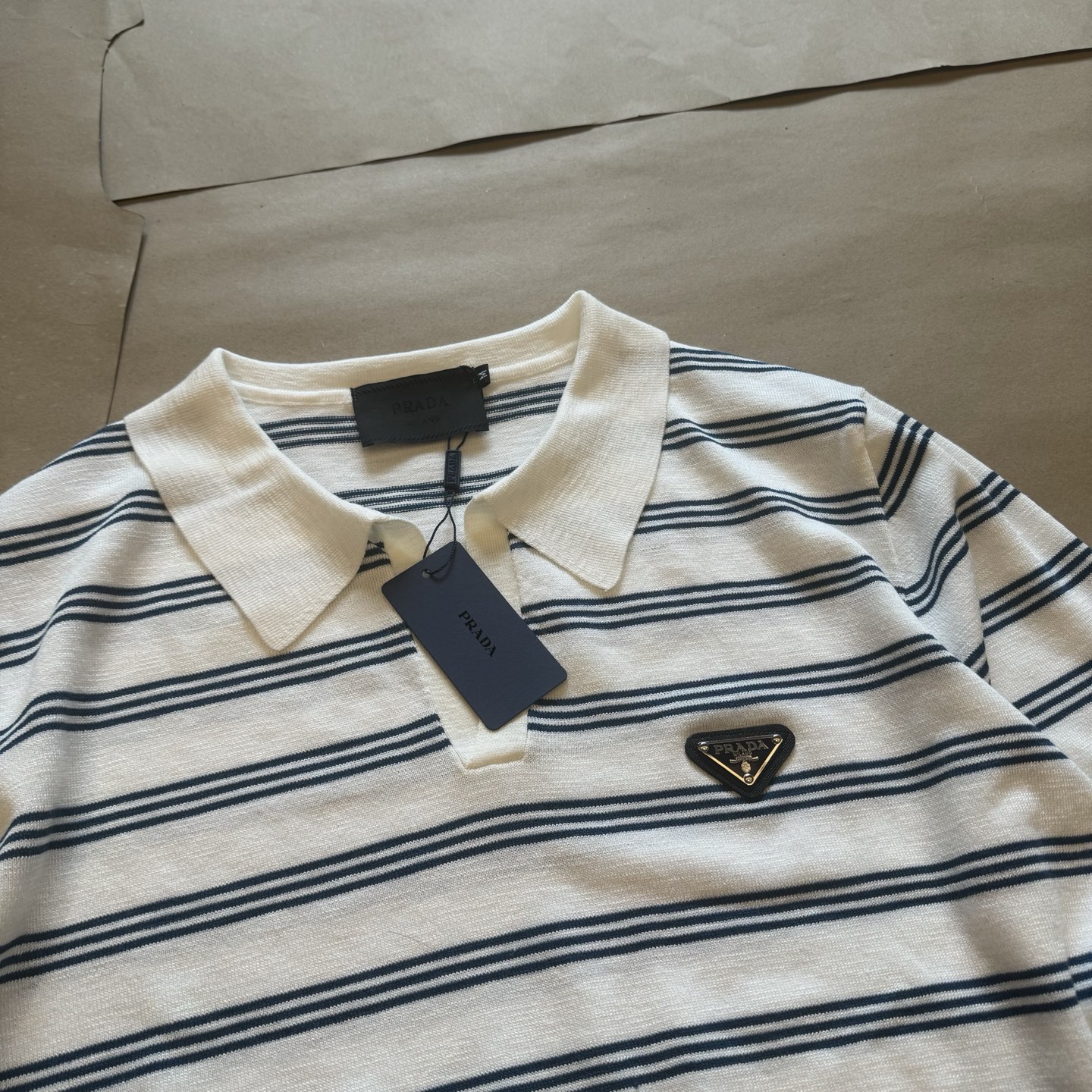 This Prada polo knit epitomizes relaxed luxury, blending comfort with high-end fashion. The soft, lightweight fabric ensures a comfortable experience, while the classic logo adds a touch of brand prestige. The shirt's relaxed fit makes it versatile for various occasions, providing a sophisticated yet effortless look.