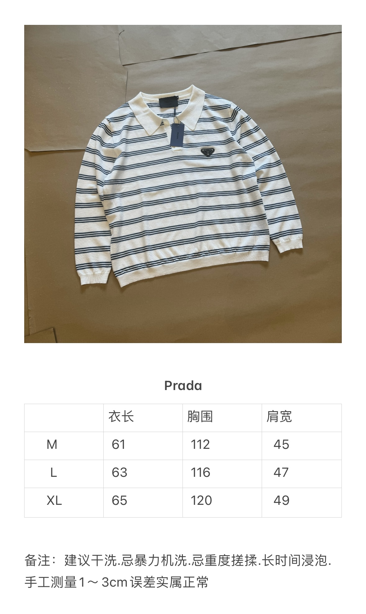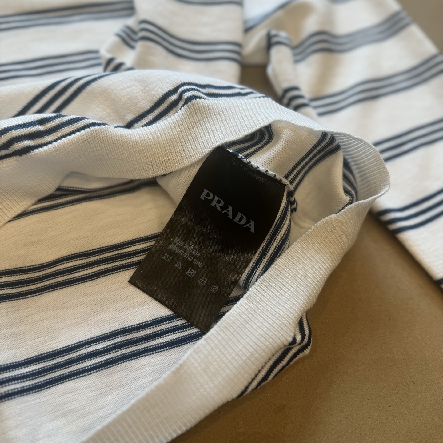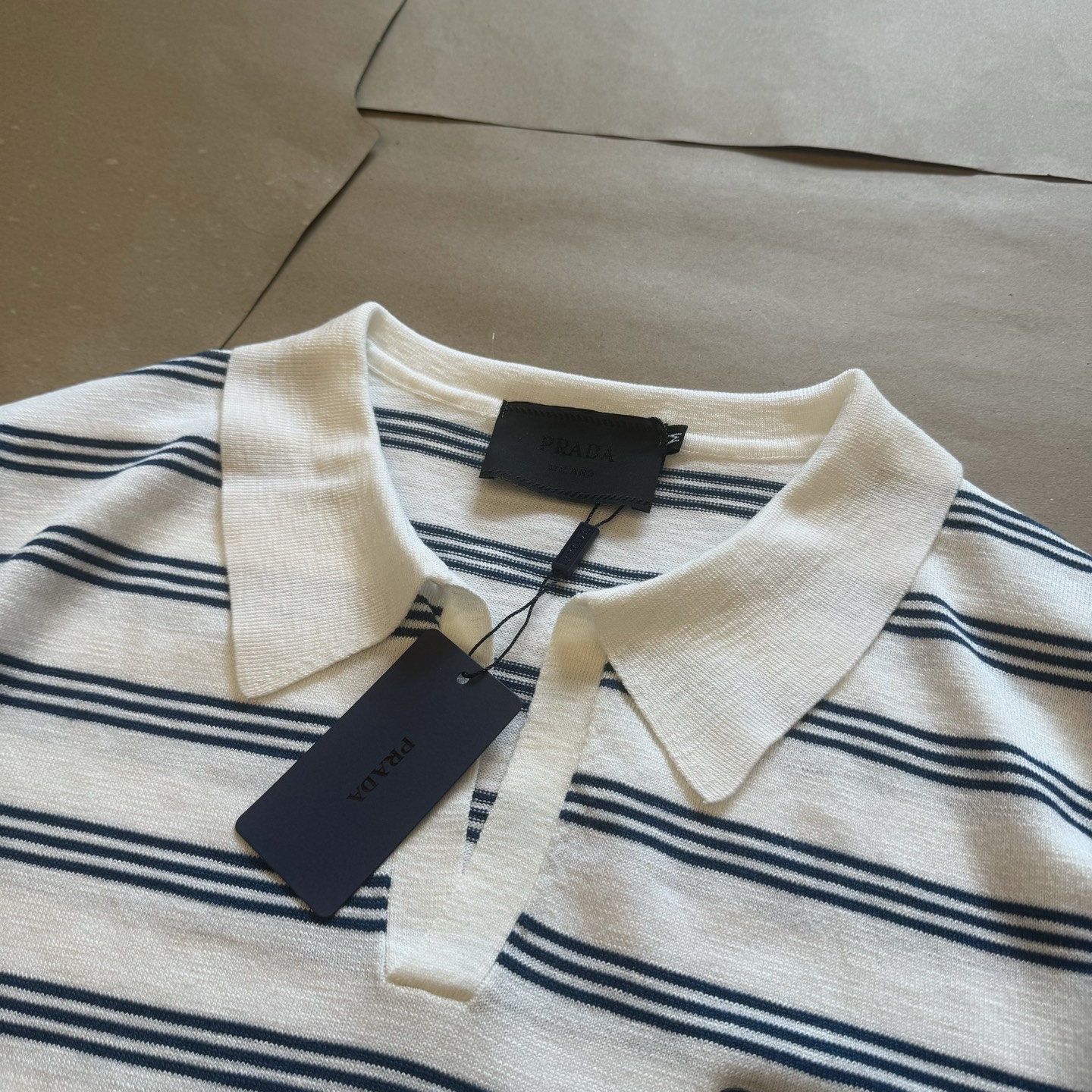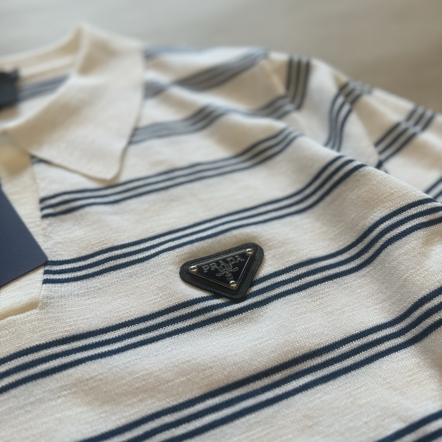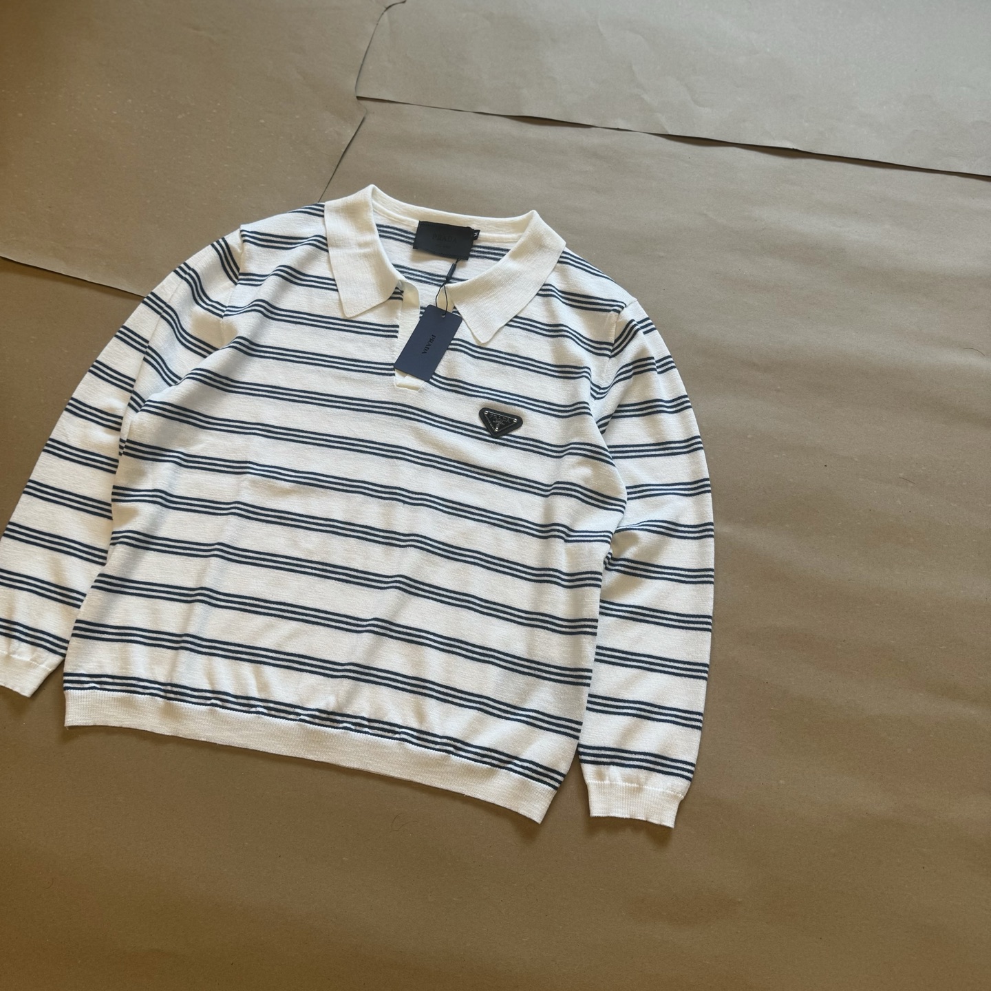 Prada Striped Polo Knit Long Sleeve Shirt - White & Blue, Classic Logo