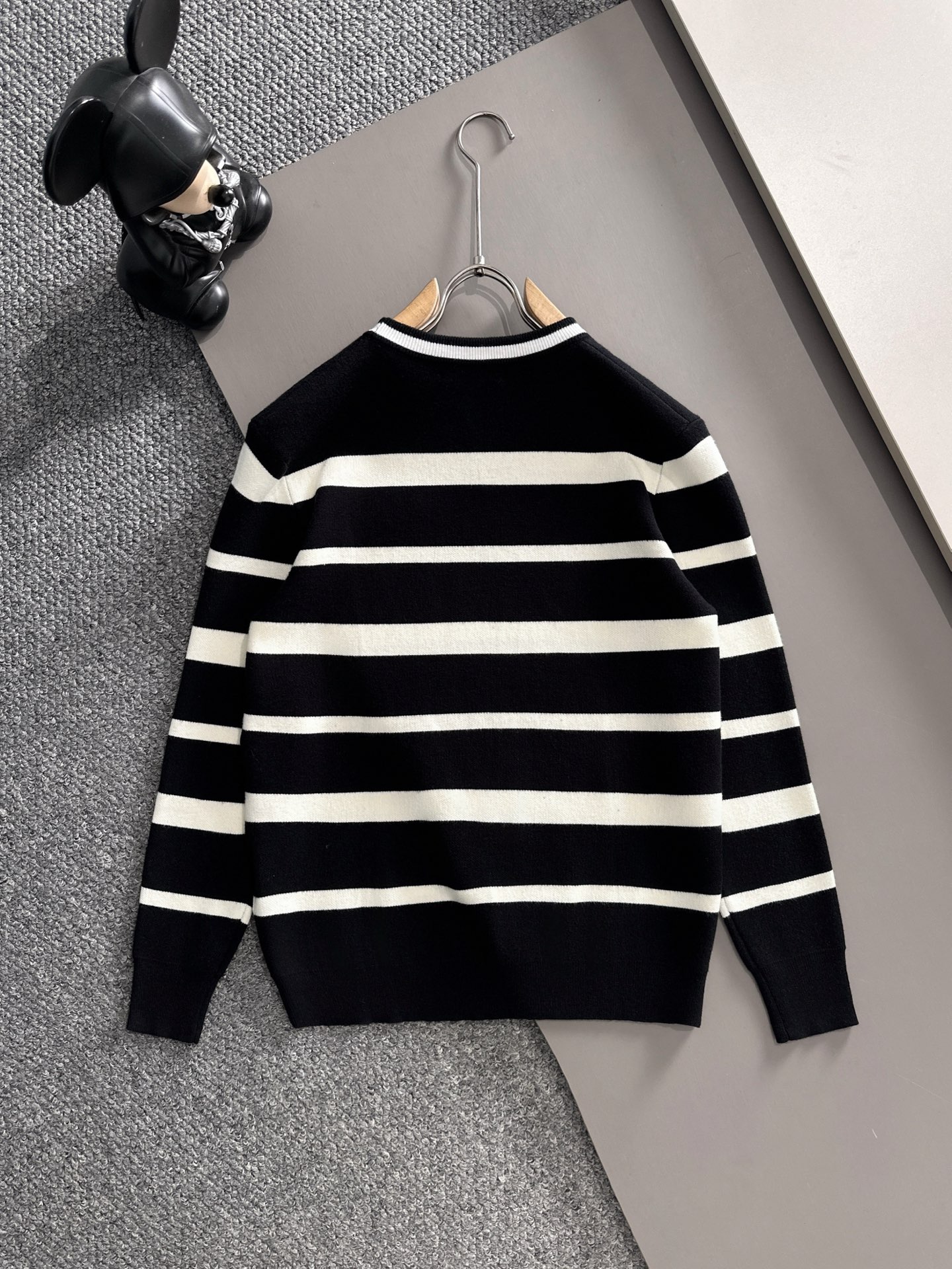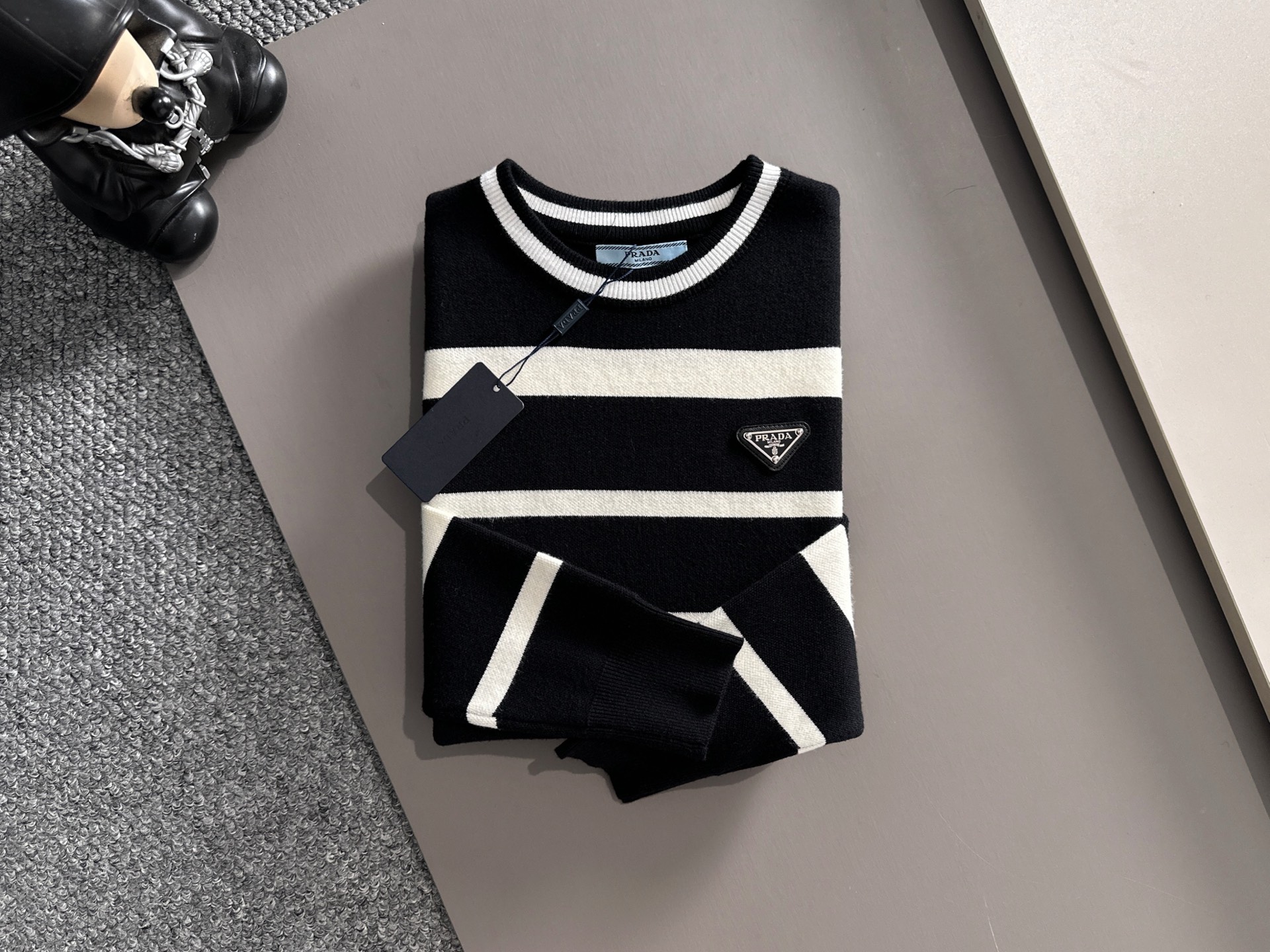 Upgrade your style with this Prada wool sweater. Features a classic fit, striped design, and the iconic metal triangle logo. Available in sizes M-XXXL.