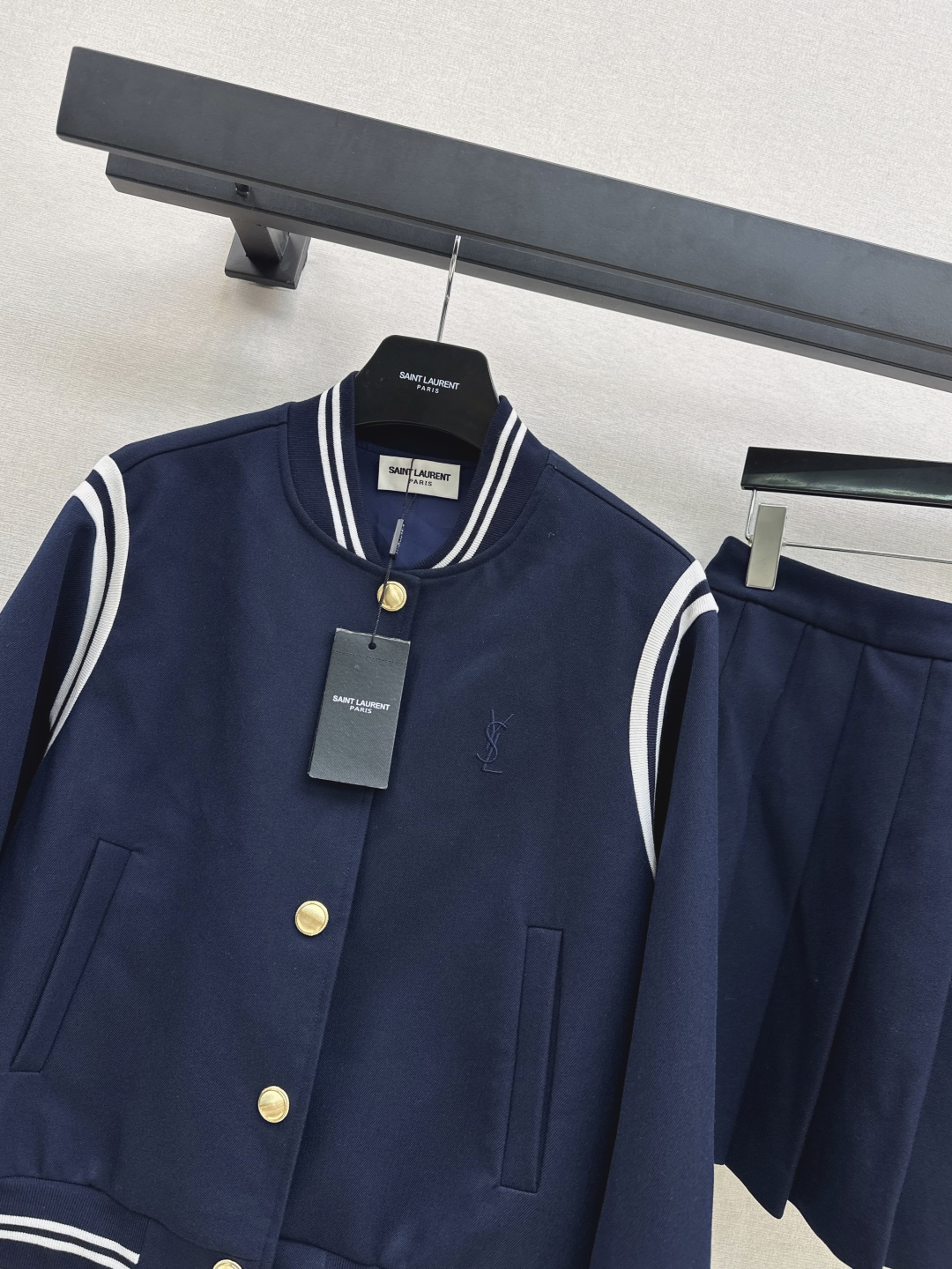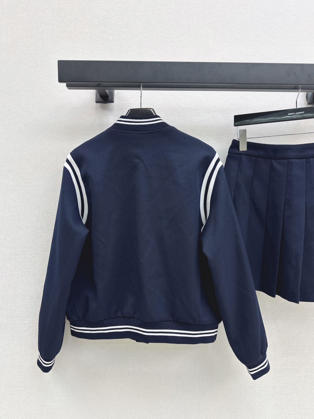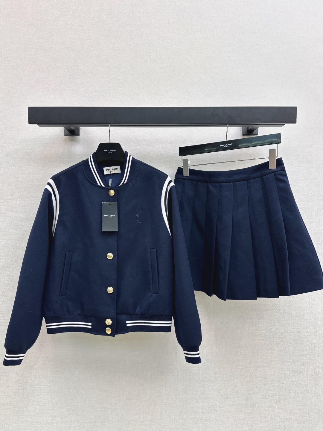 Saint Laurent Women's Navy Baseball Jacket and Pleated Mini Skirt Set