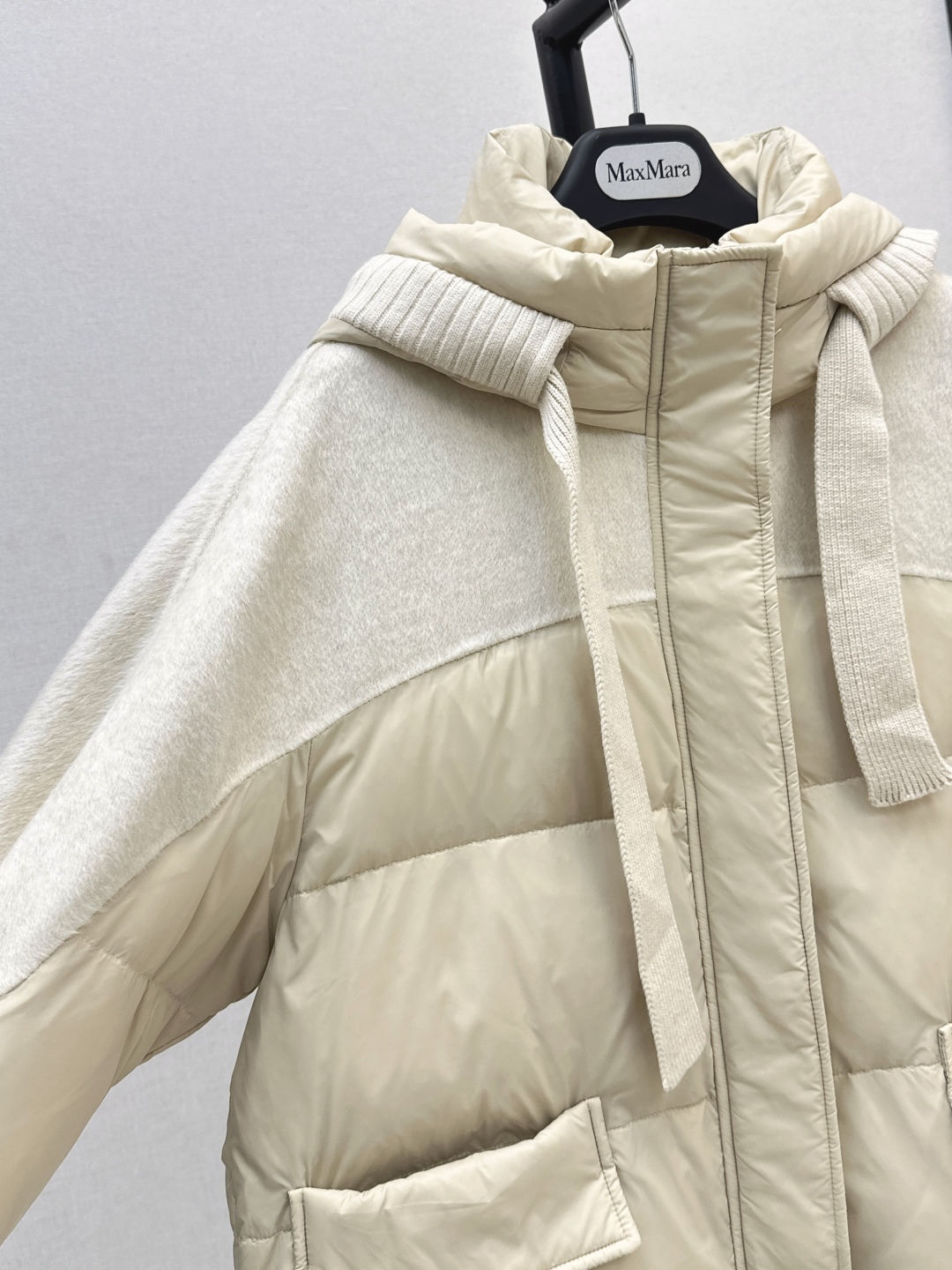 This hooded puffer coat is a stylish and functional addition to your winter wardrobe. Combining the warmth of a down-filled body with the unique texture of wool sleeves, it's designed to keep you cozy and fashionable.