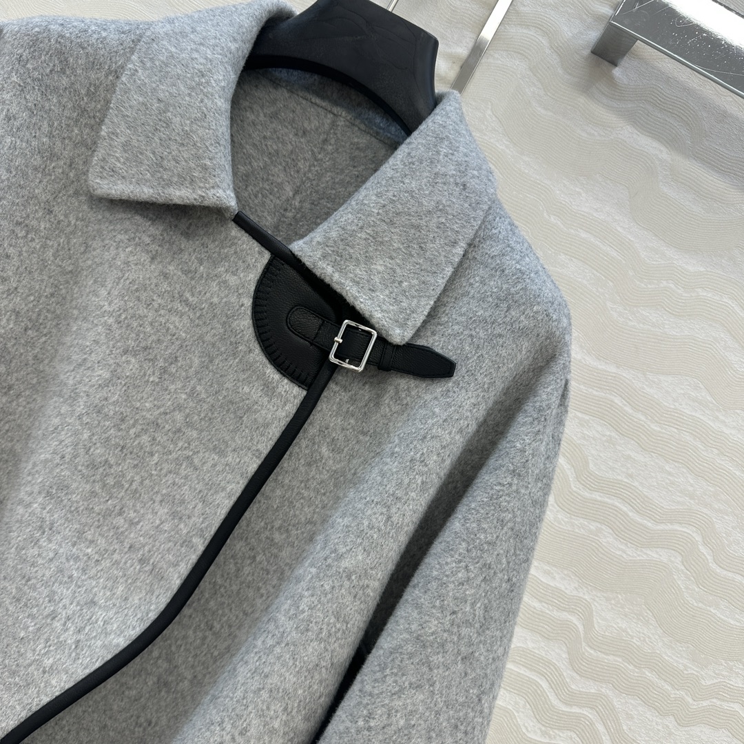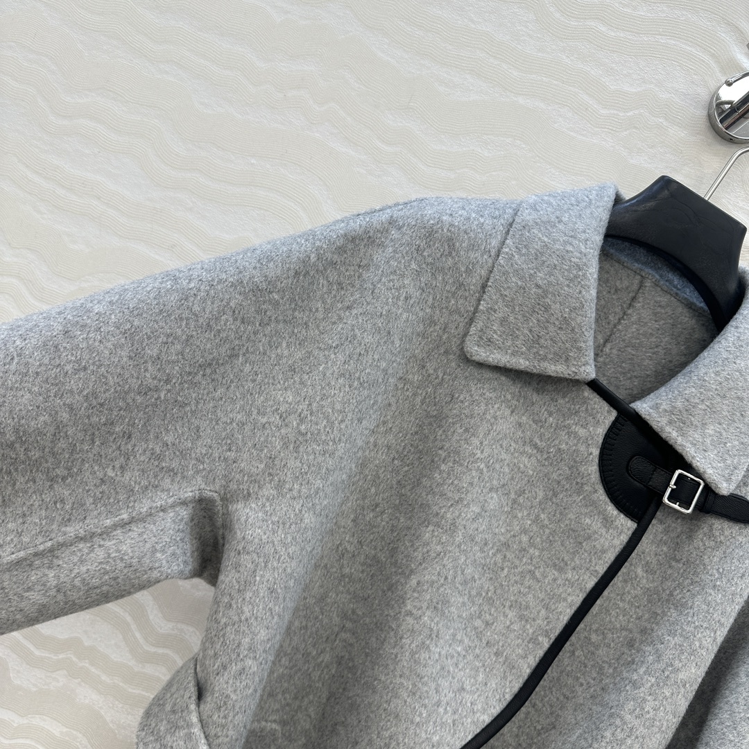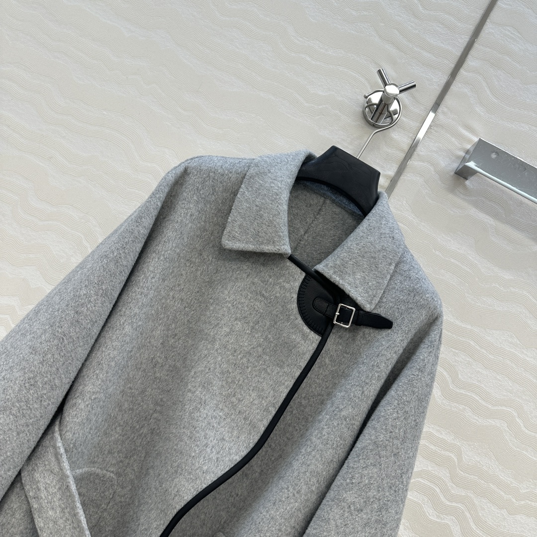 Tags: Belted Wool Coat, Elegant Women's Coat, Gray Wool Coat, Leather Detail Coat, Winter Outerwear, Wool Cashmere Coat