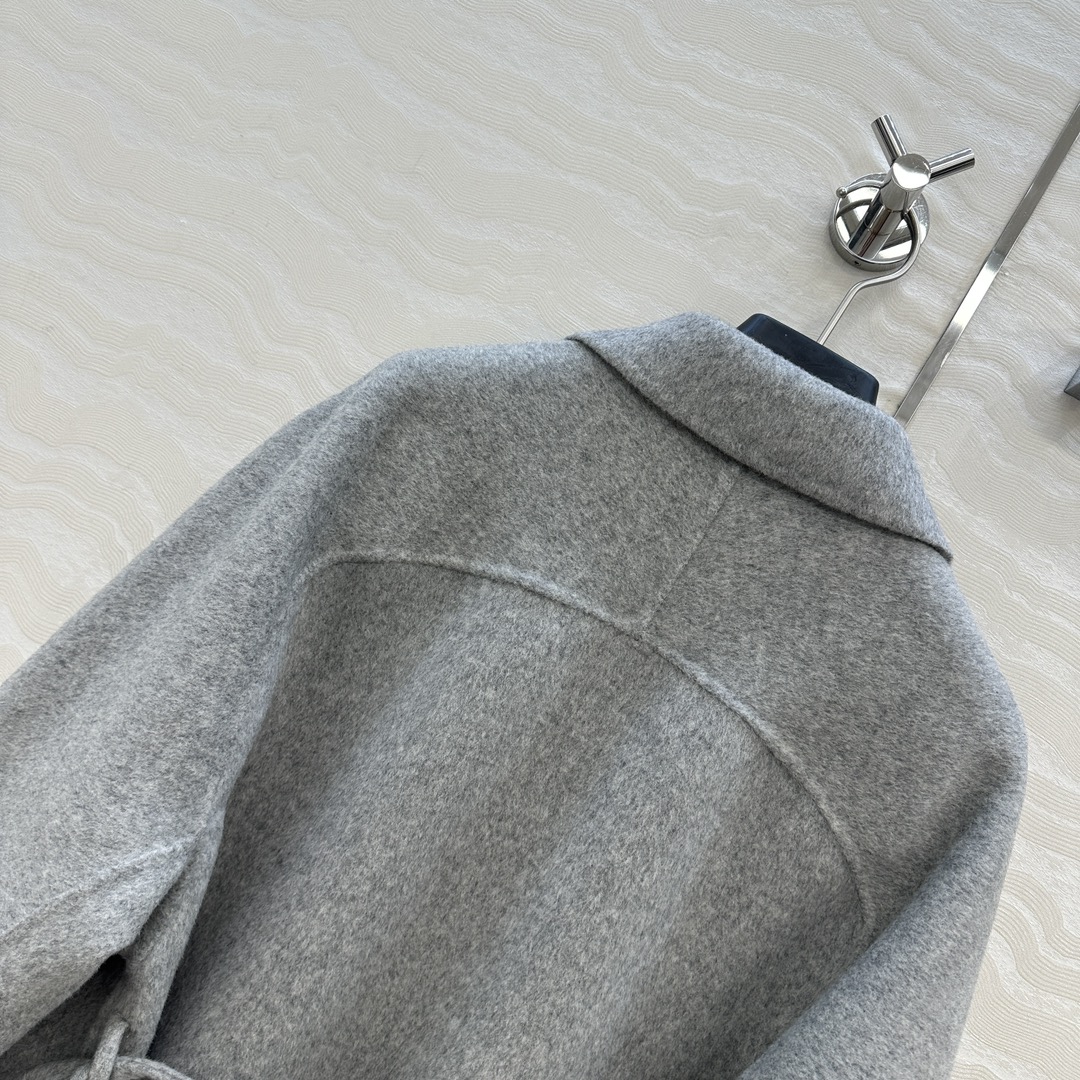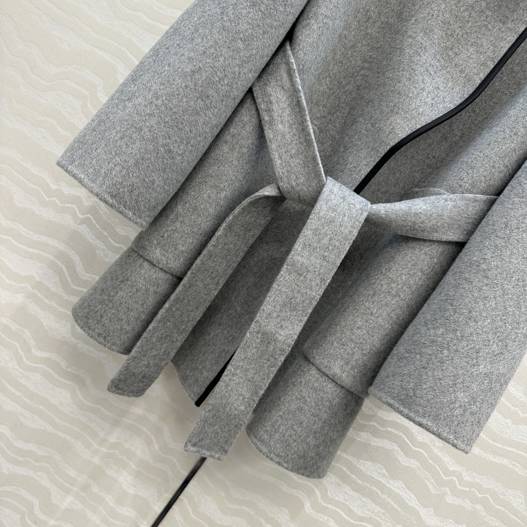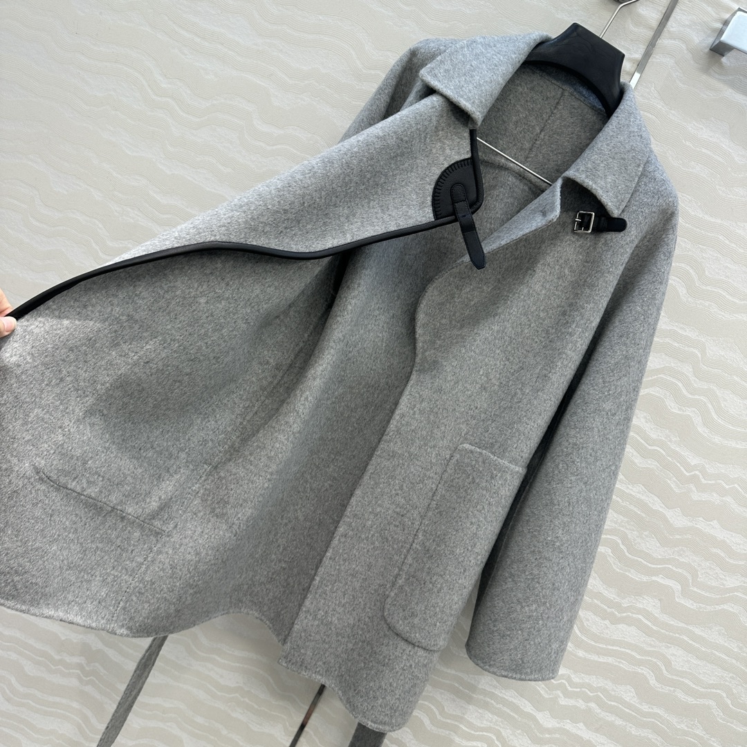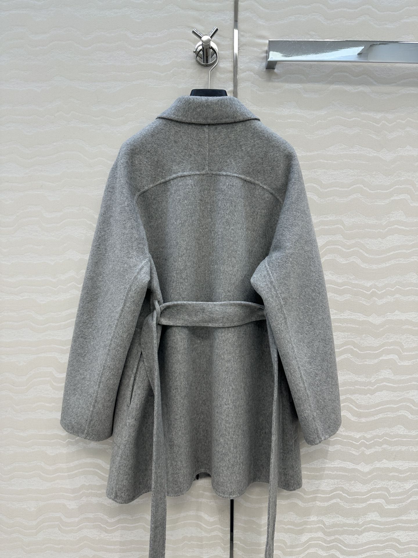Tags: Belted Wool Coat, Elegant Women's Coat, Gray Wool Coat, Leather Detail Coat, Winter Outerwear, Wool Cashmere Coat
