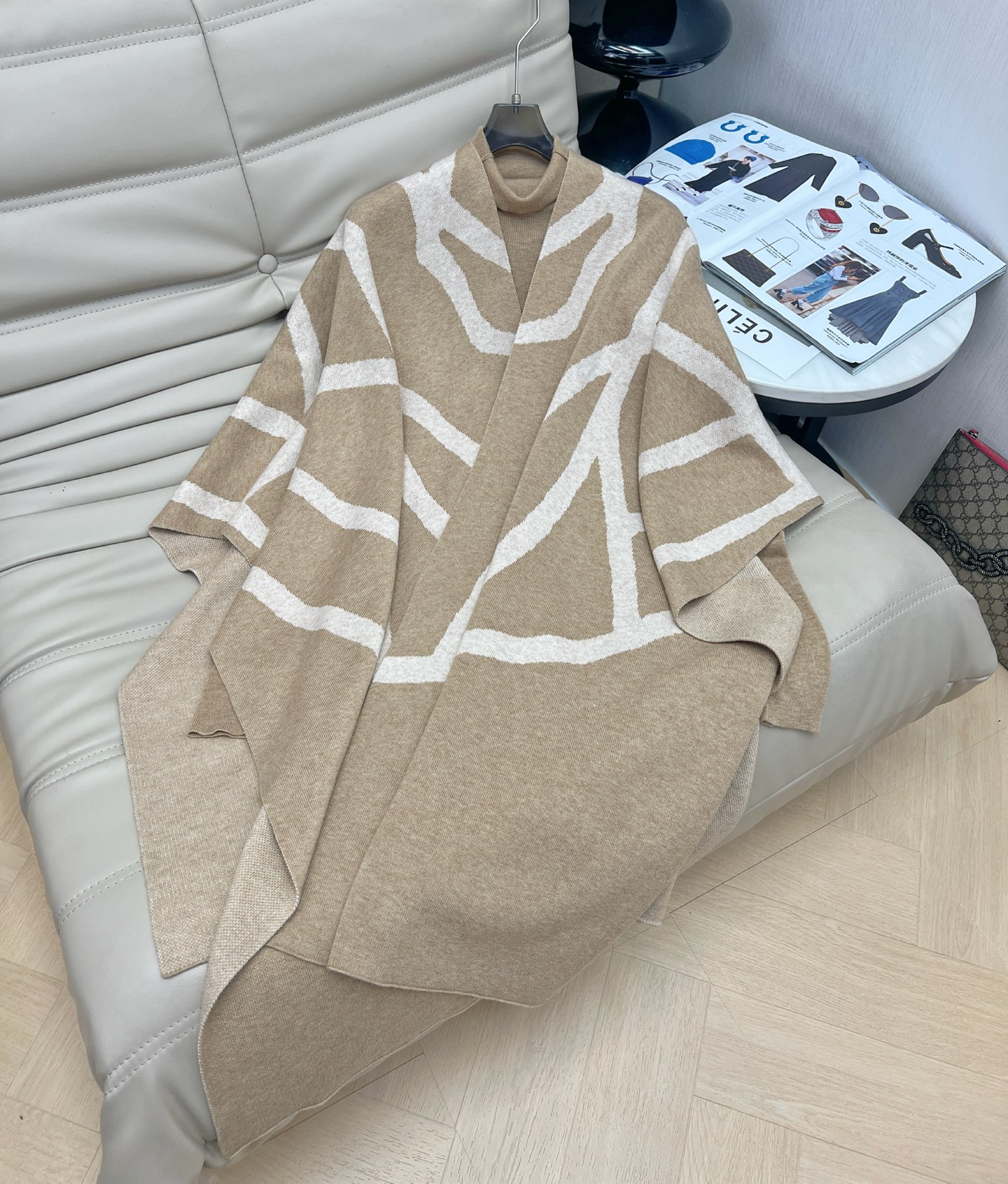 This luxurious wool set is the perfect addition to your autumn and winter wardrobe. Combining comfort and style, this three-piece set includes a cozy wool top, matching pants, and a stylish cape shawl.