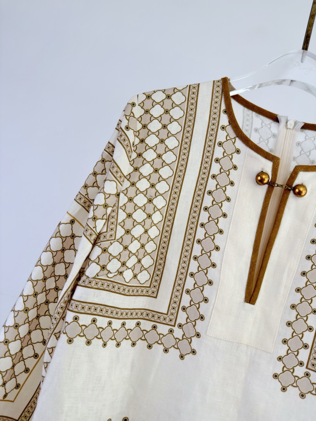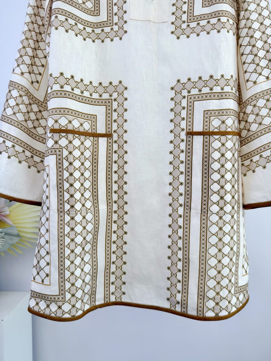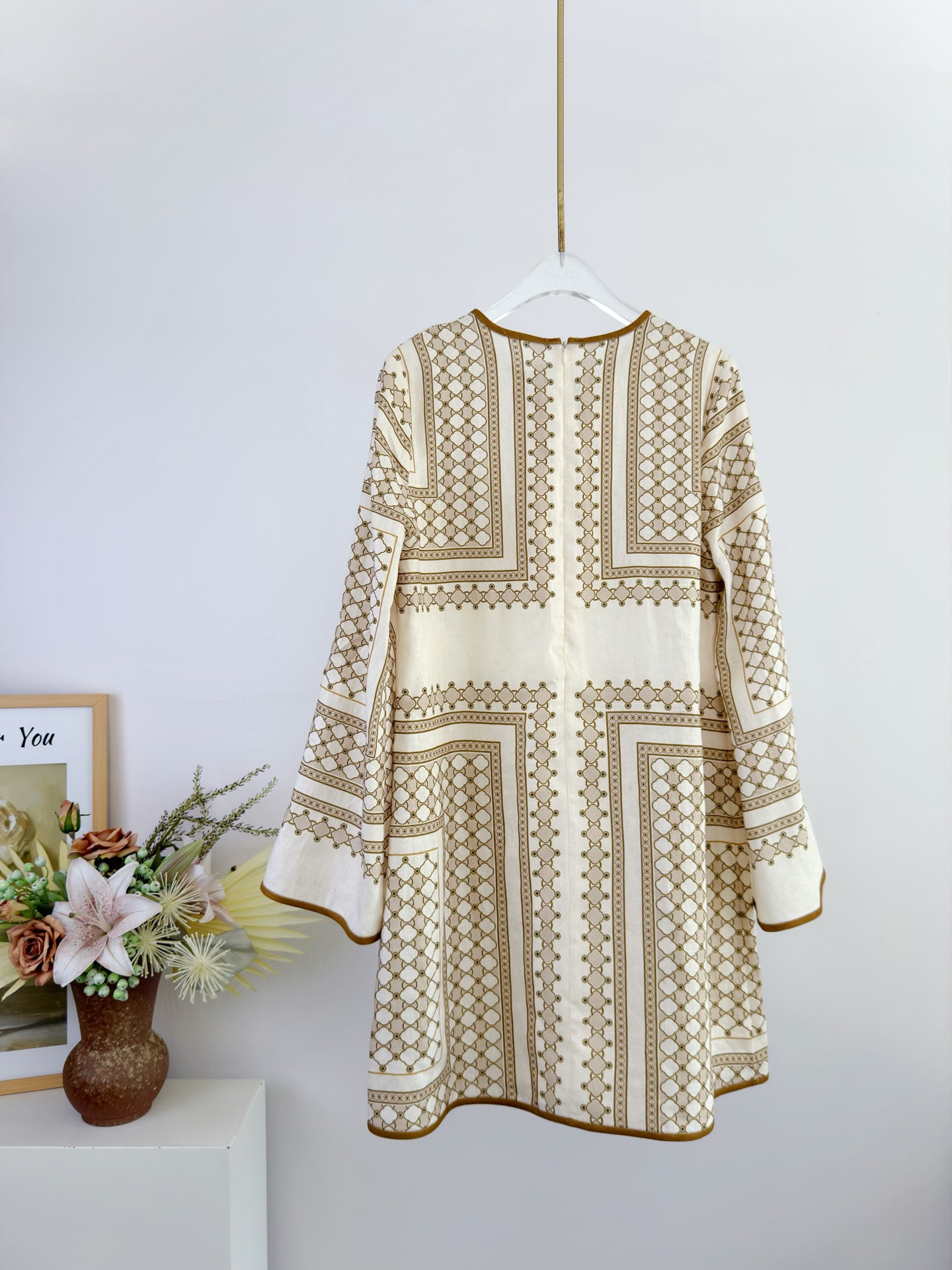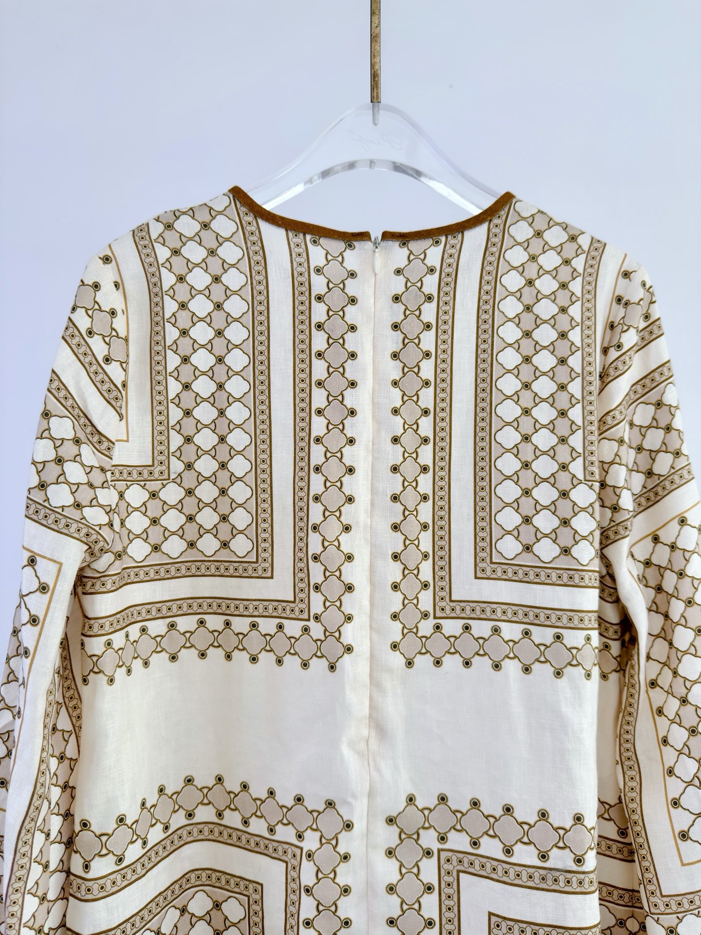 Tags: Contrast Trim Dress, Fall Fashion Dress, Geometric Print Dress, Linen Mini Dress, Long Sleeve Mini Dress, Zimmermann Mini Dress