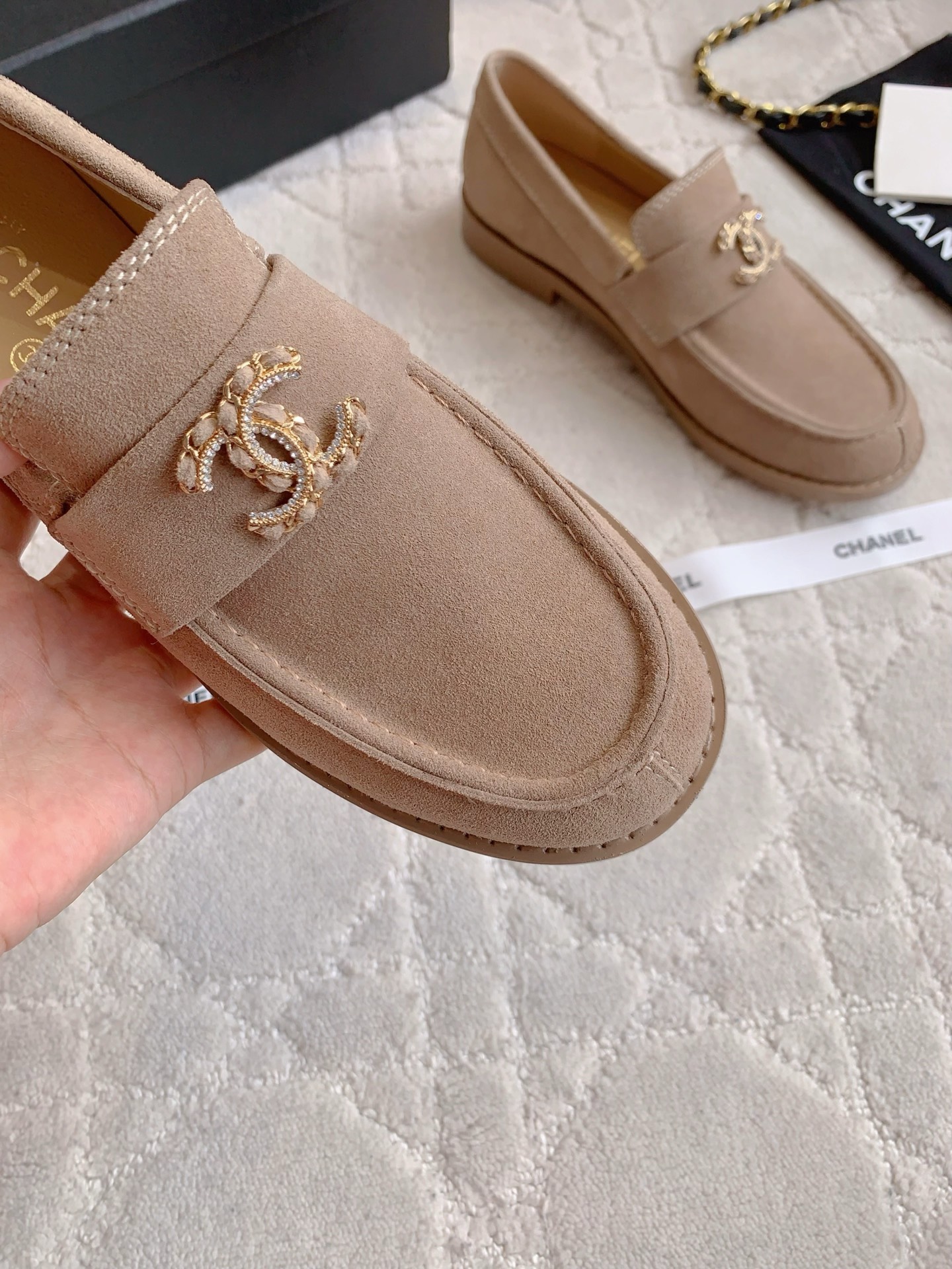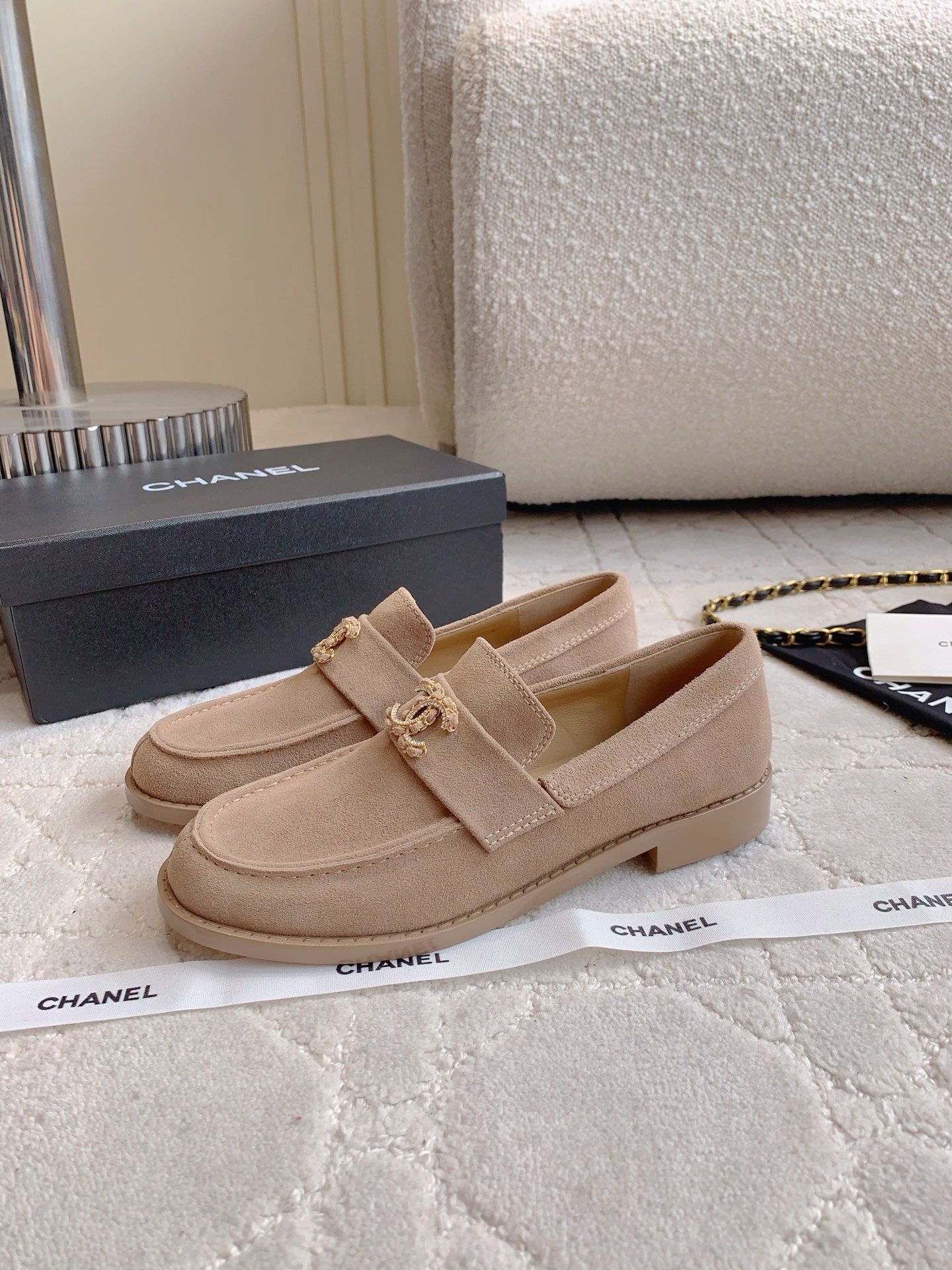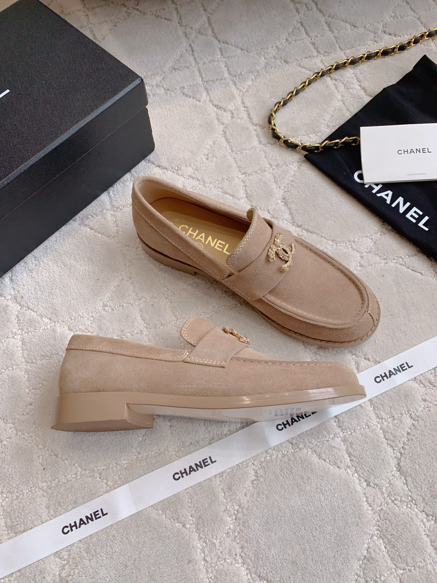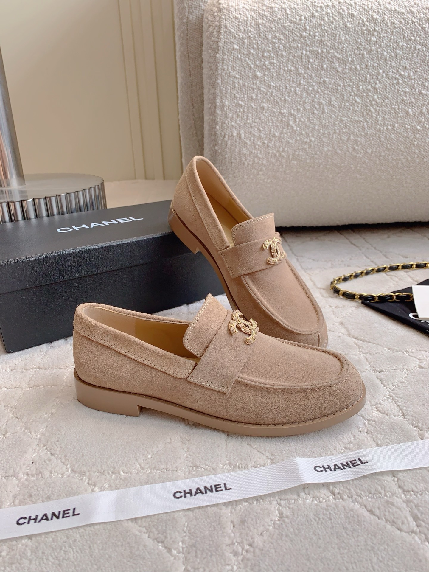 Tags: Beige Loafers, Chain Buckle Shoes, Chanel Loafers, Designer Loafers, Leather Loafers, Women's Classic Shoes